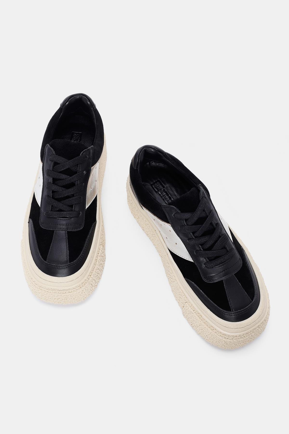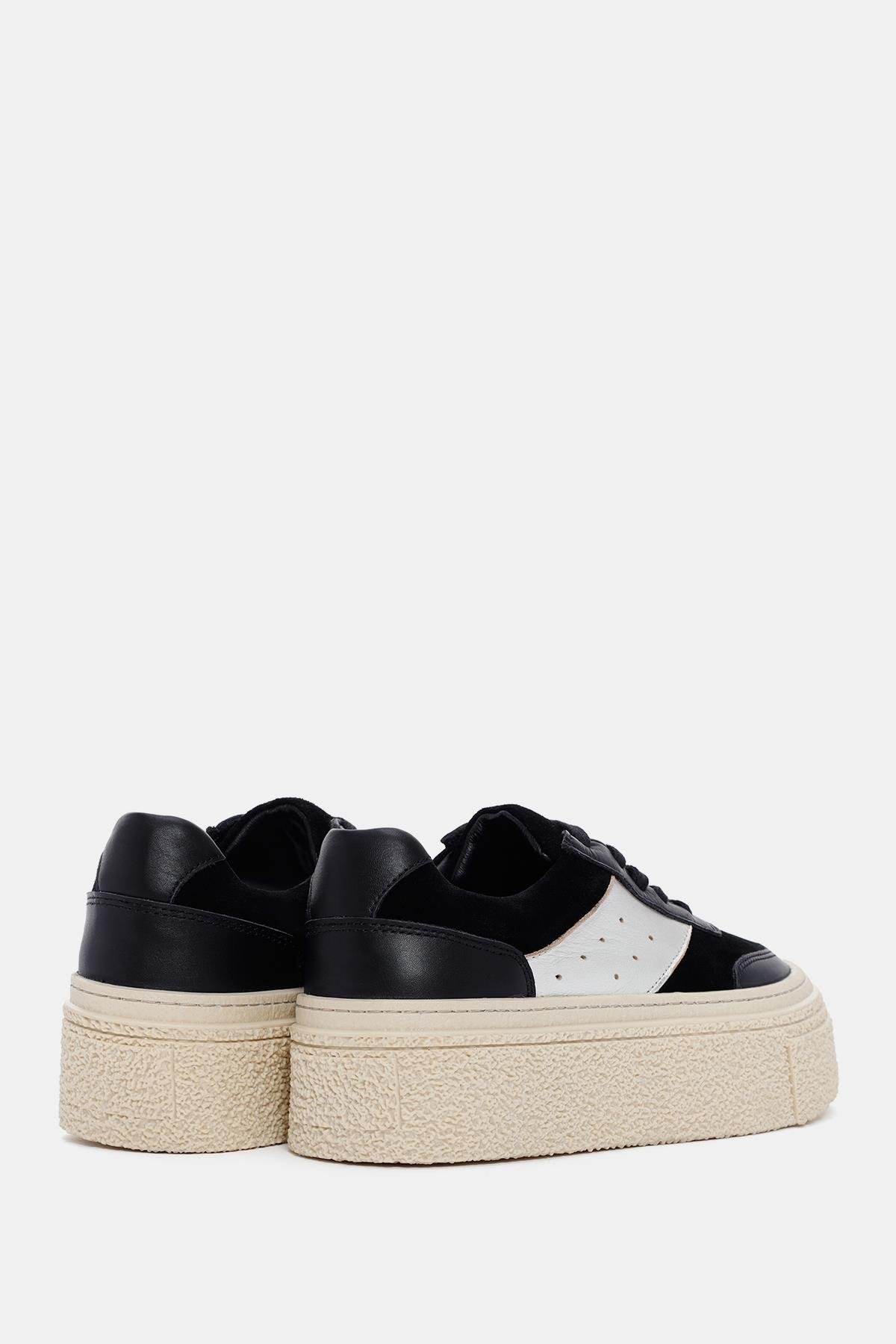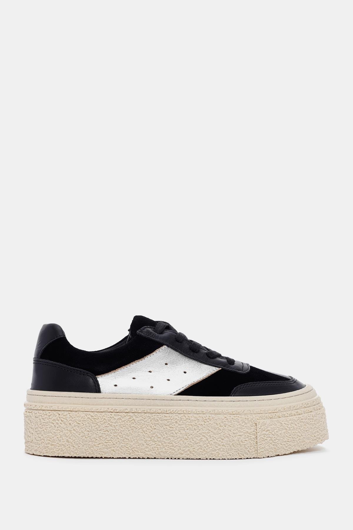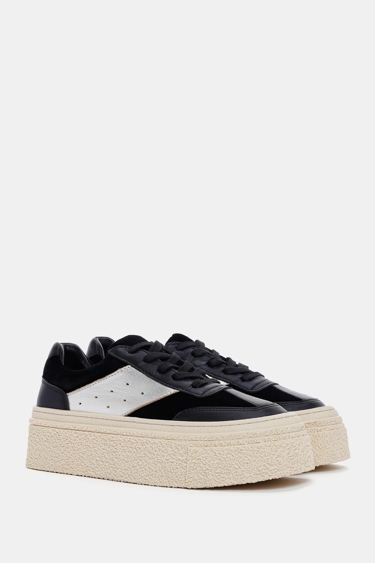 Alves Kadın Siyah-Gümüş Gerçek Deri Sneaker, siyahın zarafetini gümüş rengin göz alıcı detaylarıyla birleştirerek her kombine sofistike bir dokunuş katar. Gerçek deri dış yüzeyi, ayakkabıya kaliteli bir yapı kazandırırken, gümüş detaylar sayesinde dikkat çekici bir stil sunar.