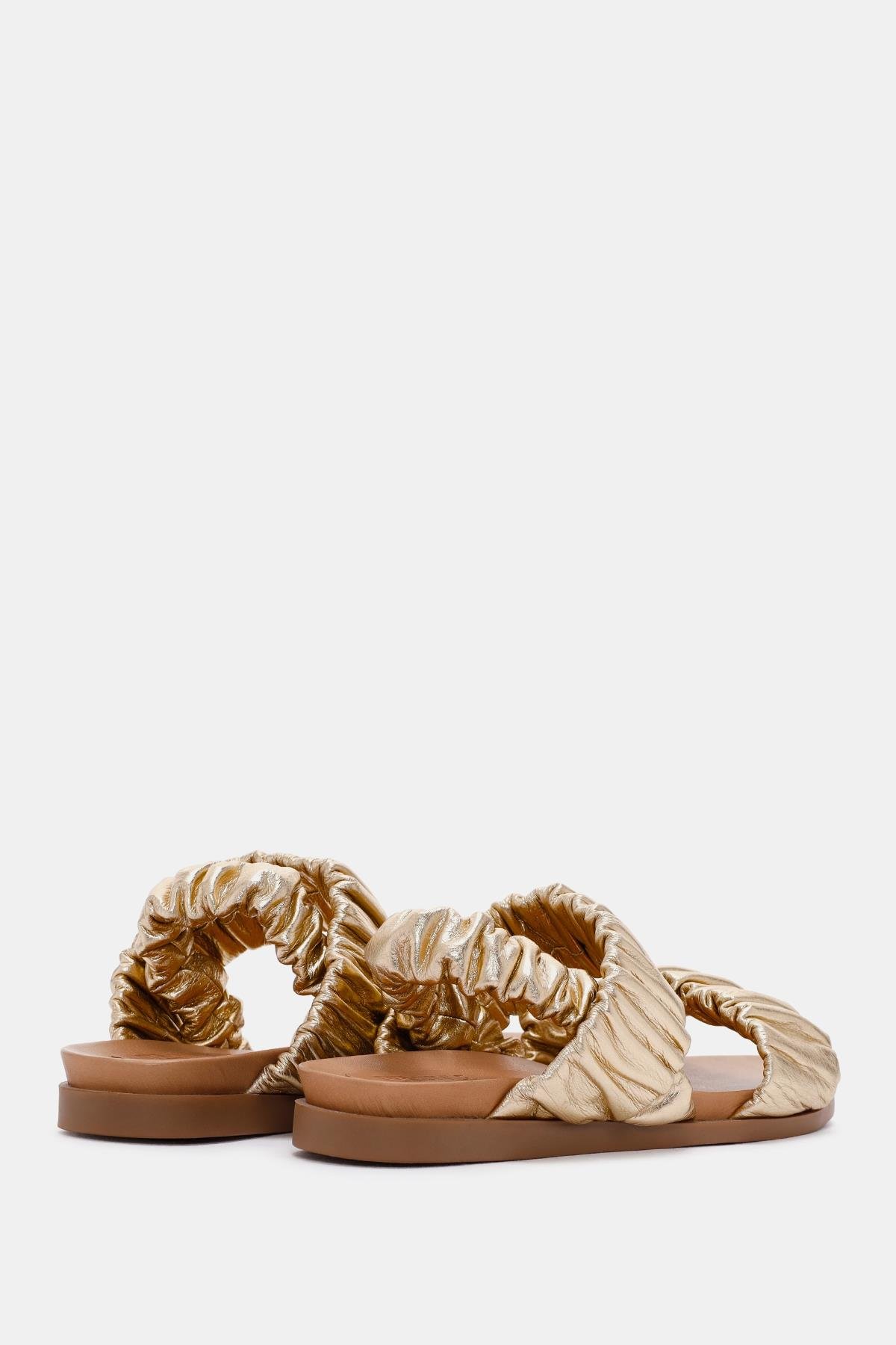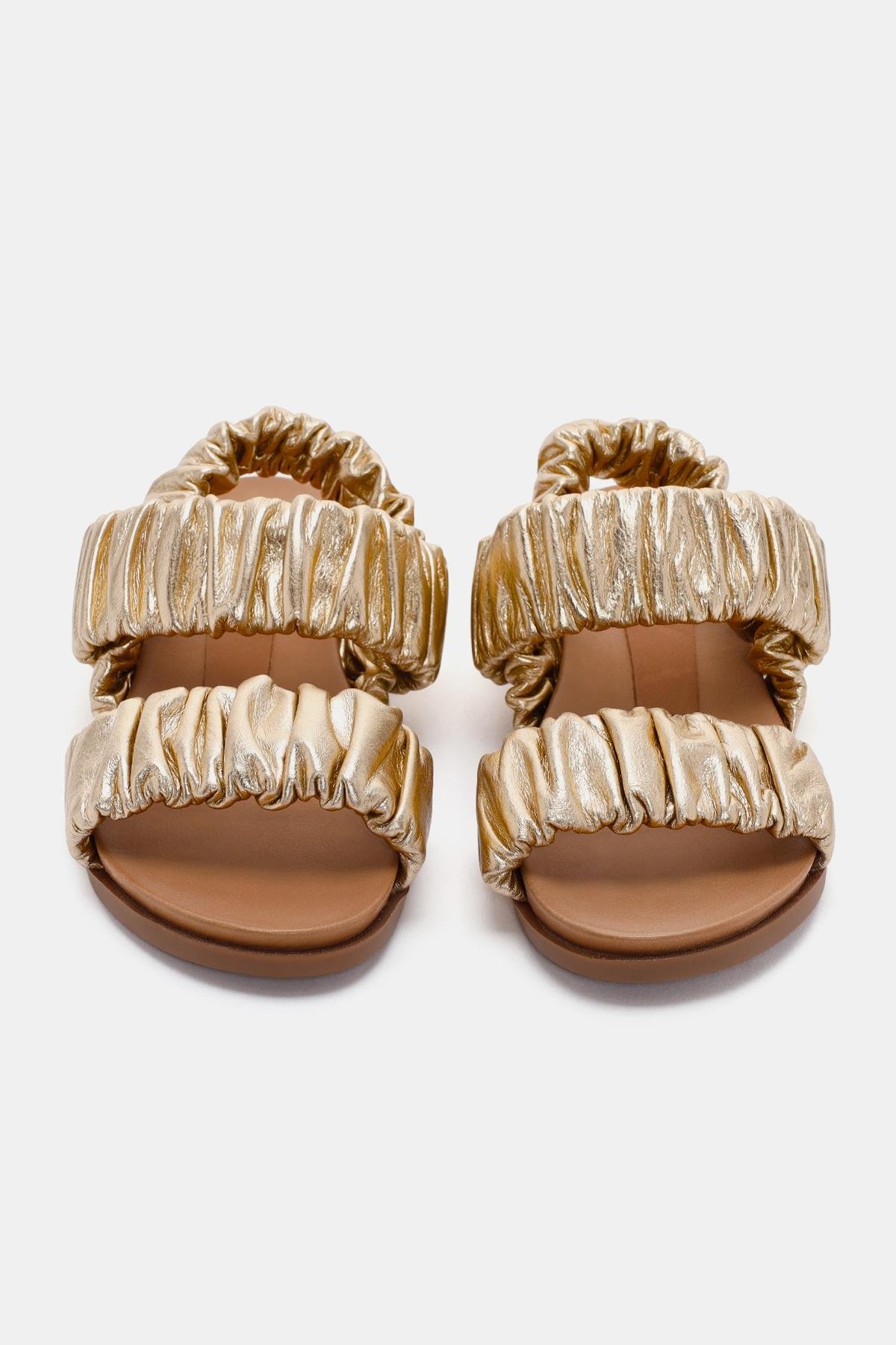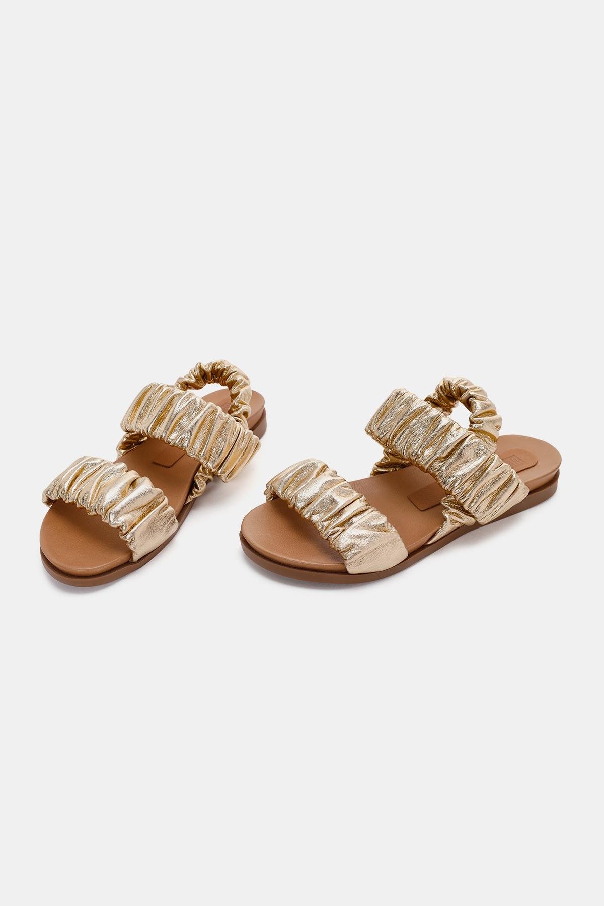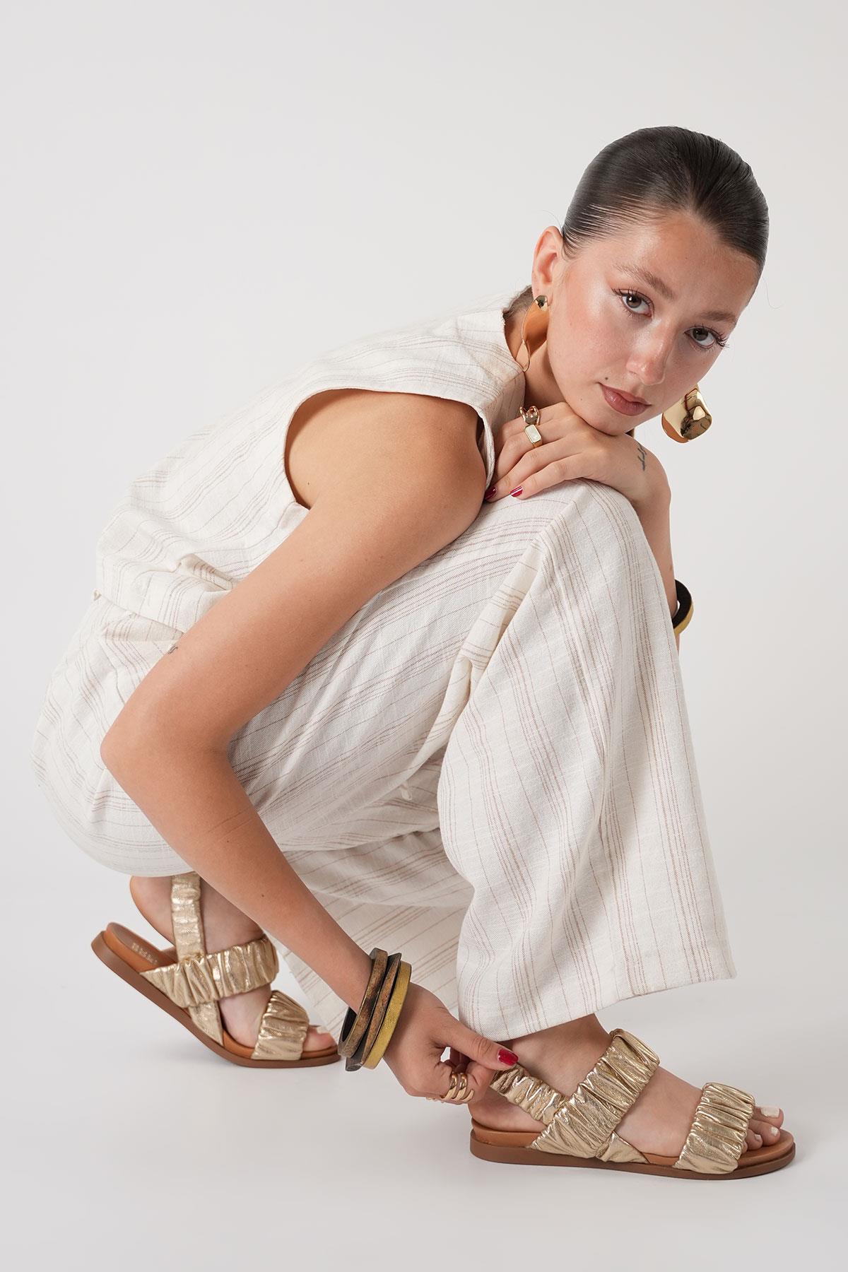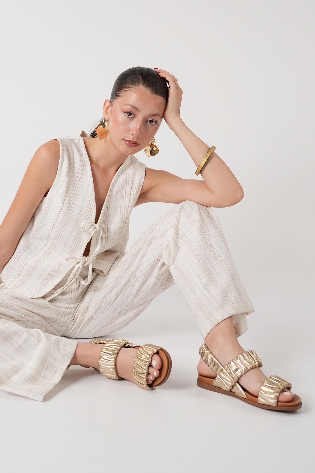 Aure Kadın Altın Gerçek Deri Sandalet, şıklığı ve kaliteyi bir araya getiriyor. Parlak altın rengi ve gerçek deri malzemesiyle öne çıkıyor. Hem günlük kullanım hem de özel günler için mükemmel bir seçenektir.