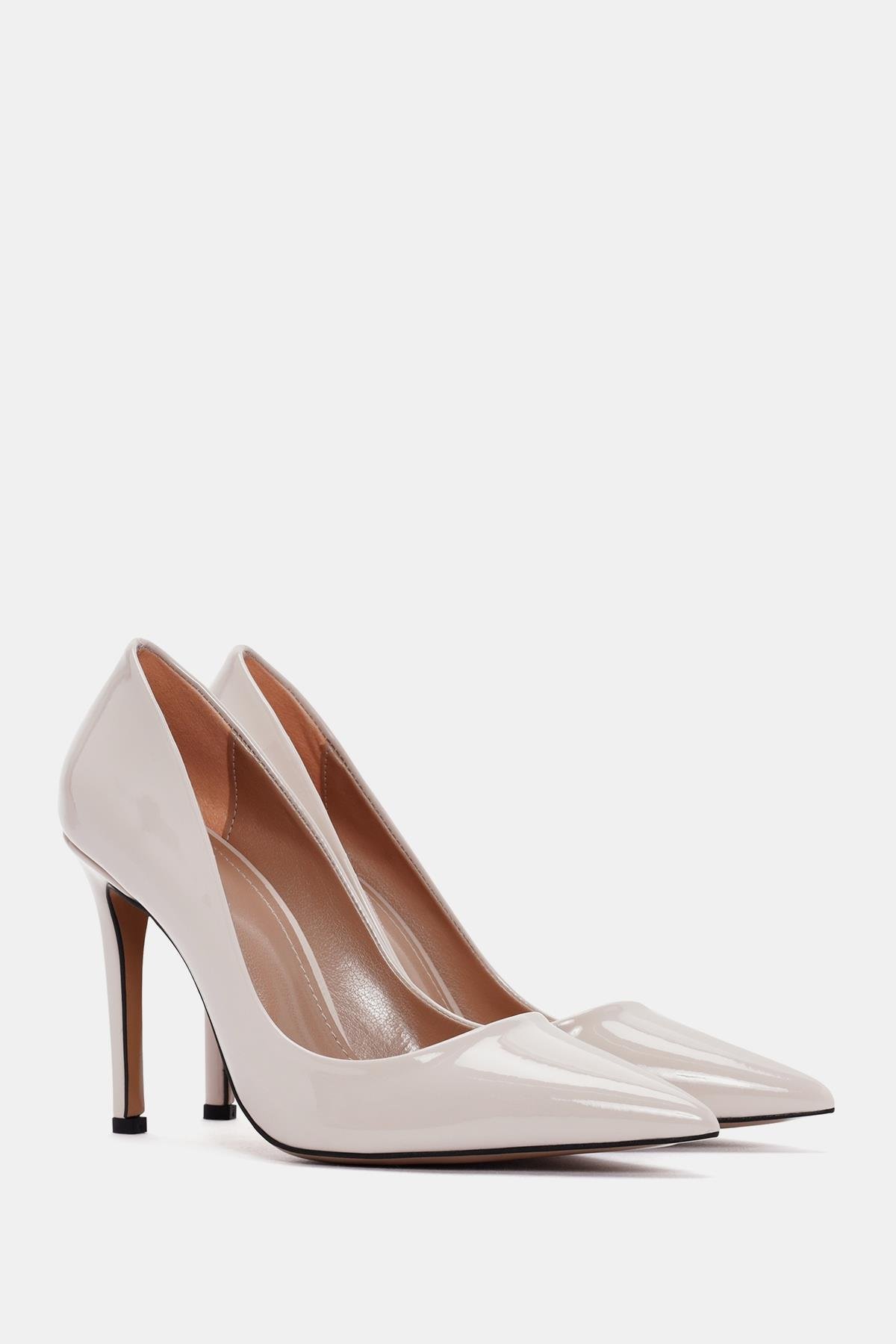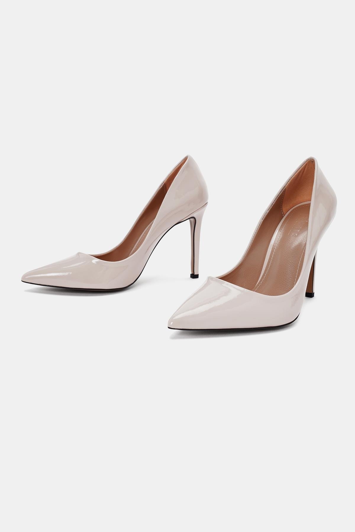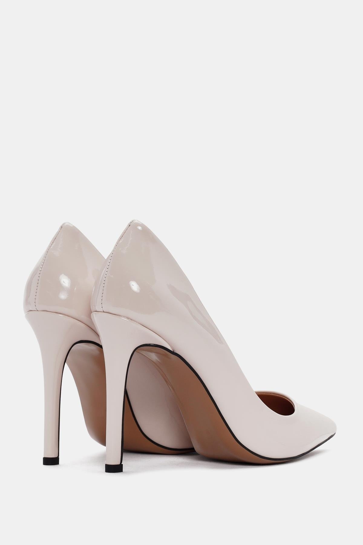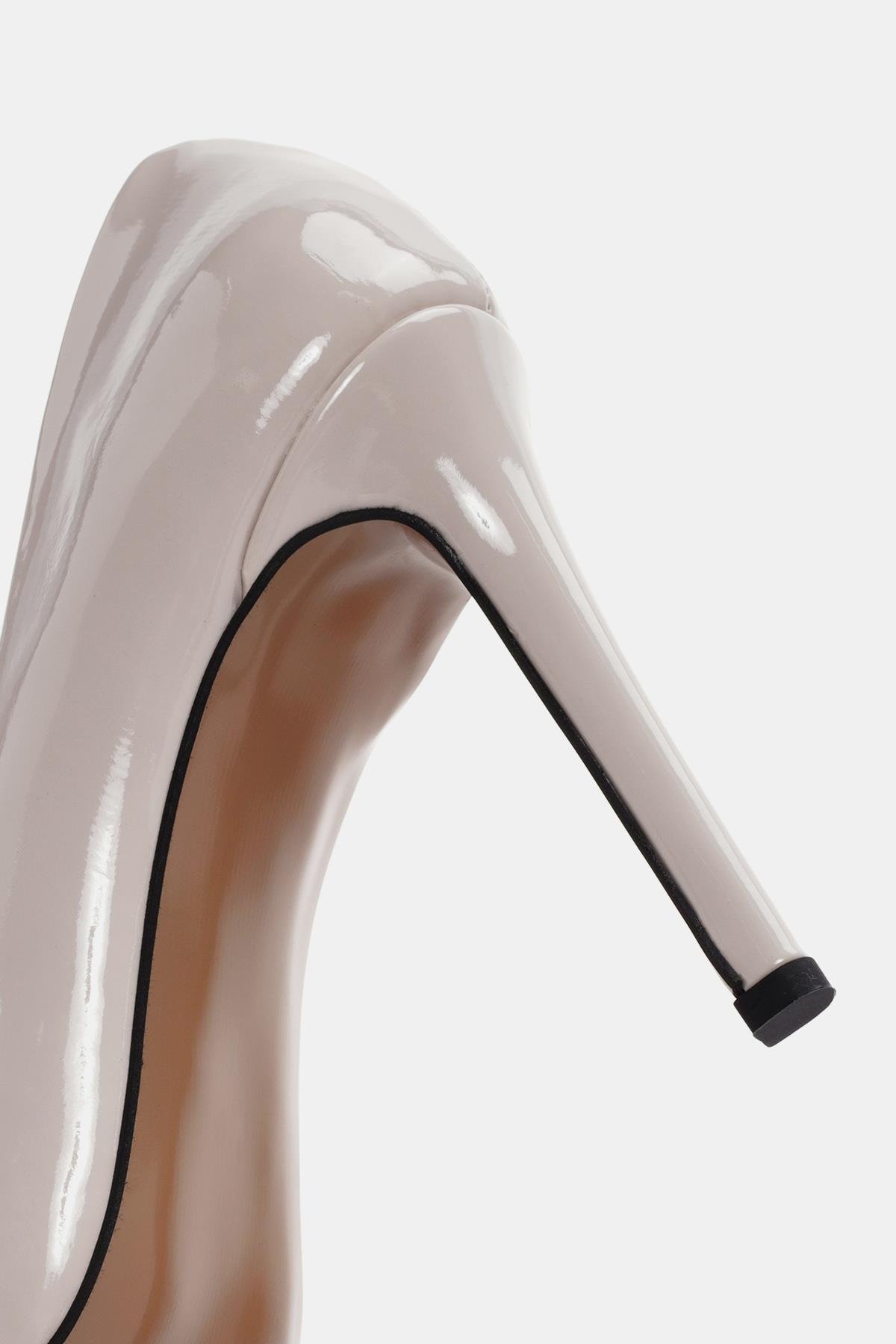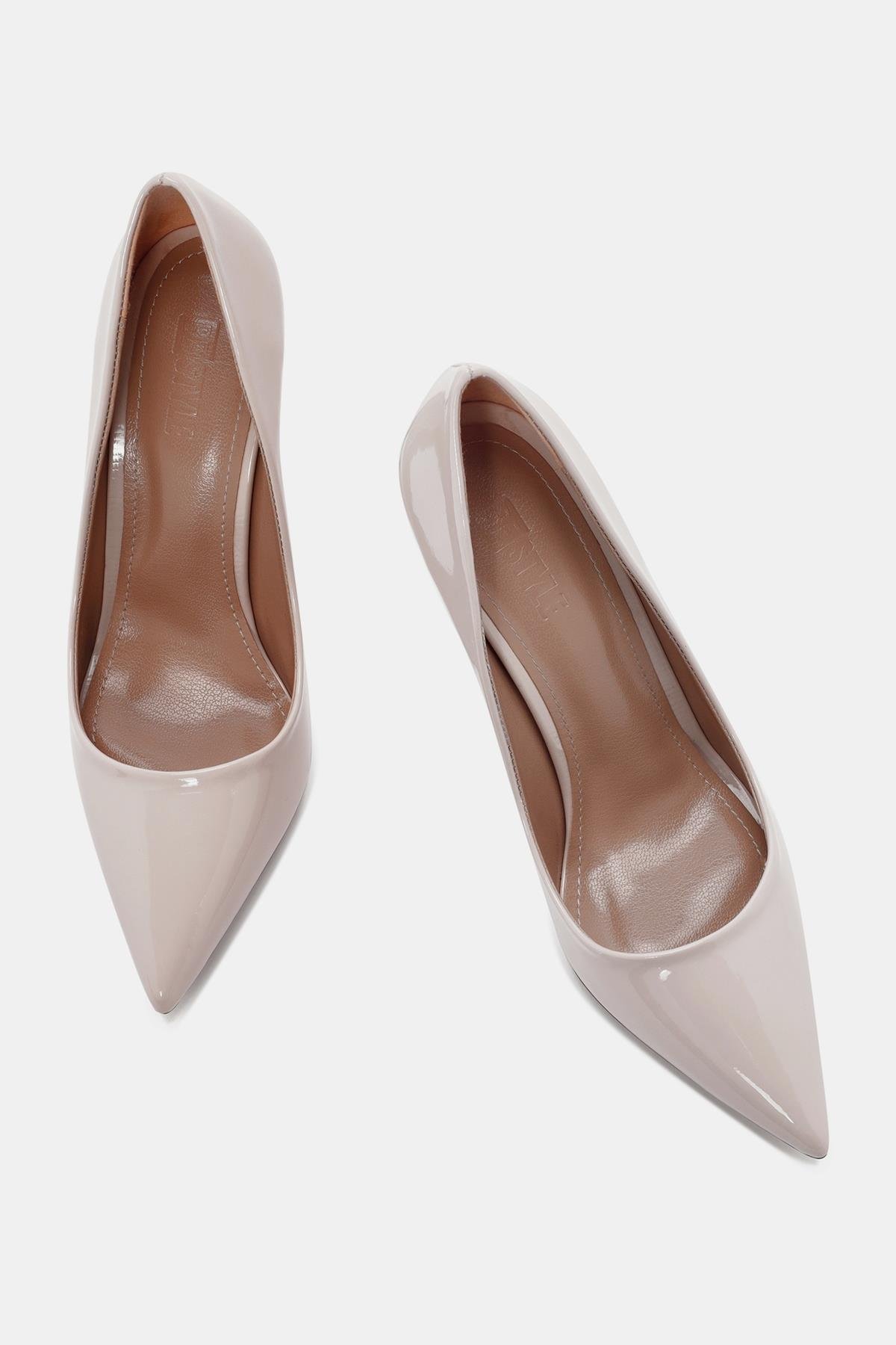 Bu ayakkabı, yüksek topuklu tasarımıyla zarif bir görünüm sunarken, nude rugan malzemesiyle de öne çıkıyor.