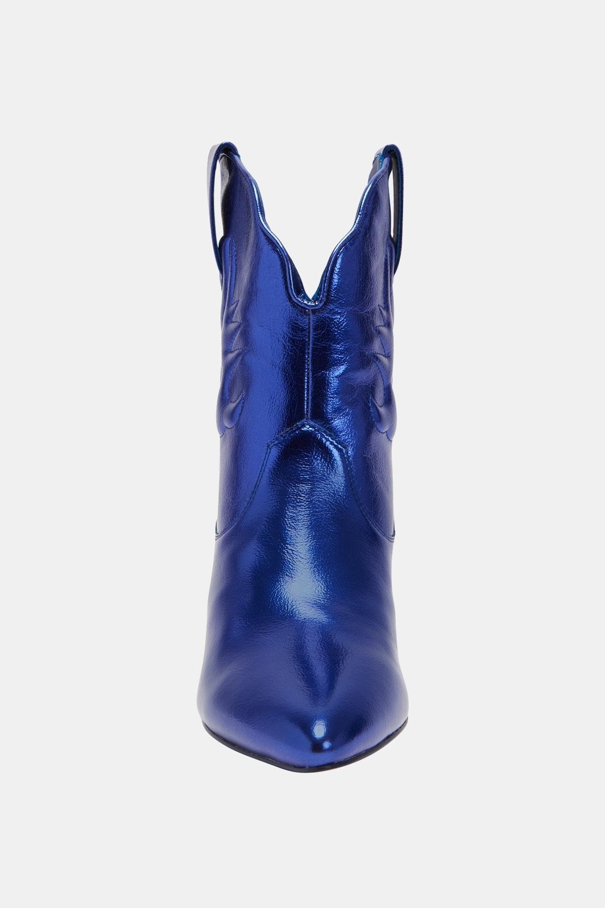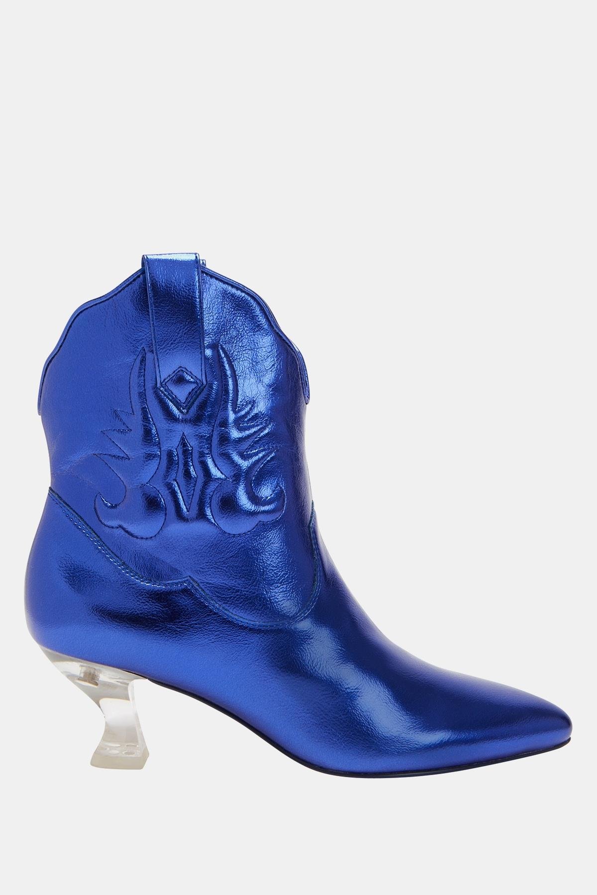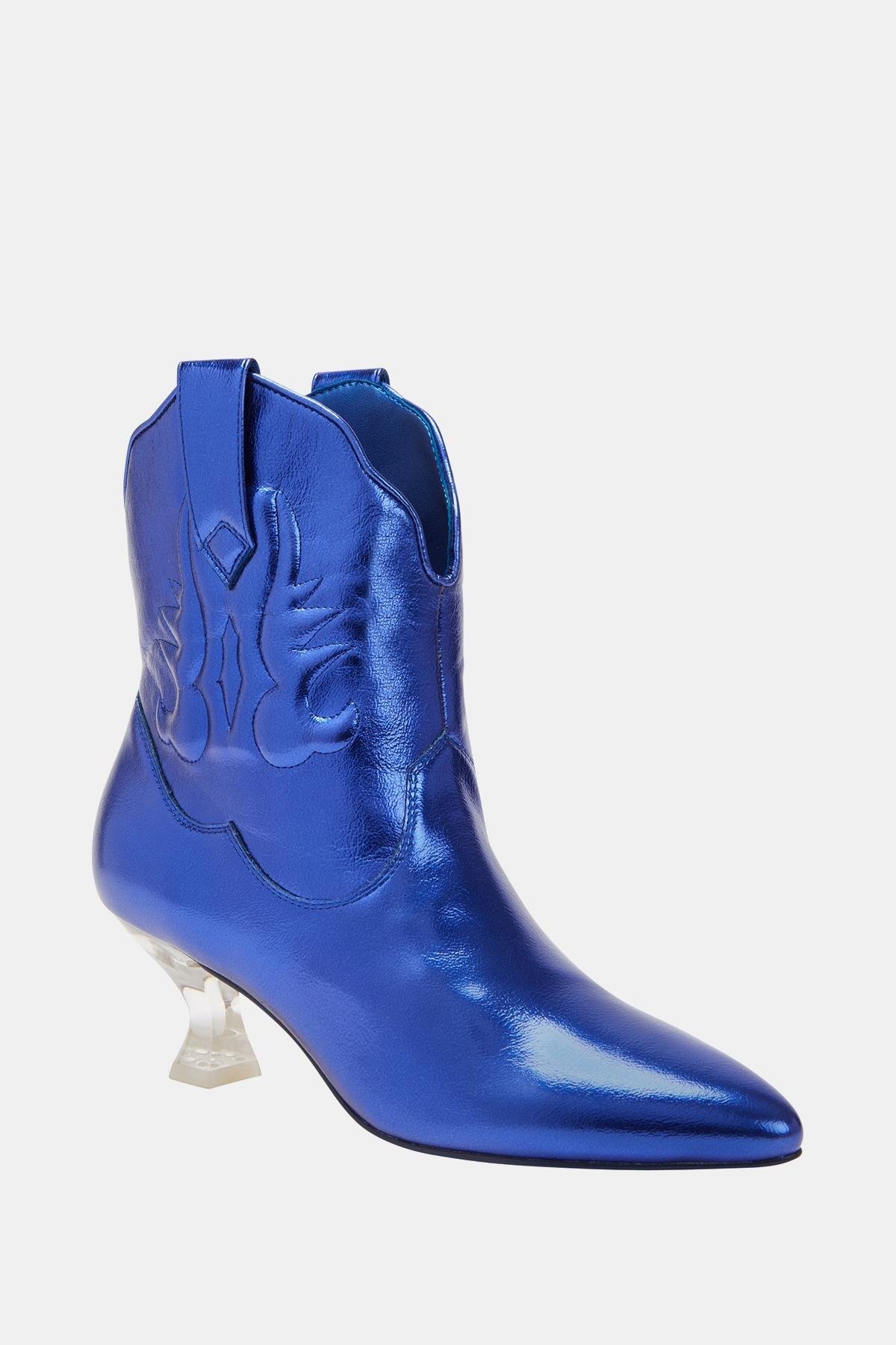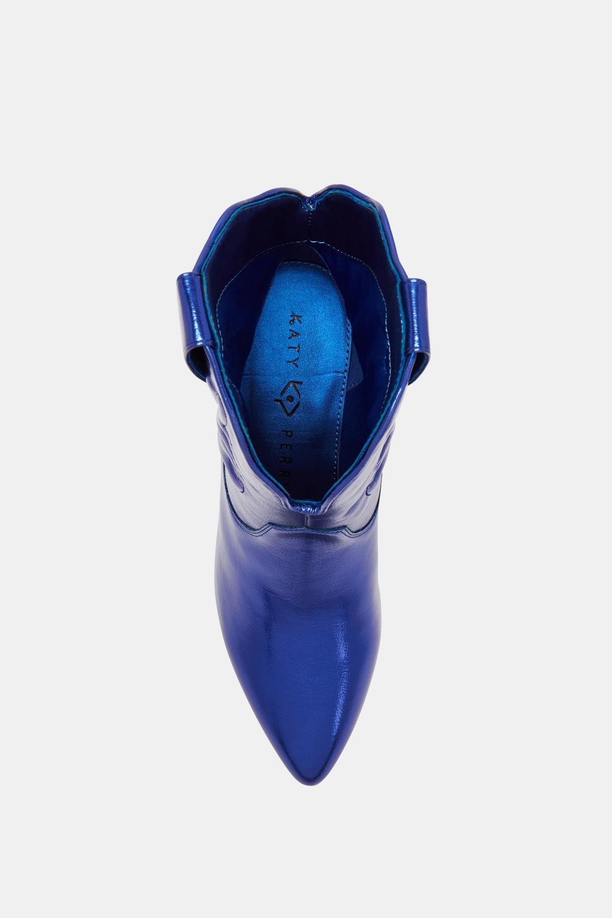 Katy Perry Annie-O Kadın Mavi Western Tasarım Bot, Katy Perry koleksiyonunun bir parçası olarak, Vahşi Batı'nın ikonik stilini şehirli şıklıkla buluşturan eşsiz bir tasarım sunuyor. Metalik Nappa malzeme ile tasarlanan bu bot, cesur mavi rengi ve modern detaylarıyla dikkat çekiyor. Sivri burun tasarımı ve alçak, yay şeklindeki lucit topuğu sayesinde gündüzden geceye stilinizi kusursuz bir şekilde taşıyabilirsiniz.