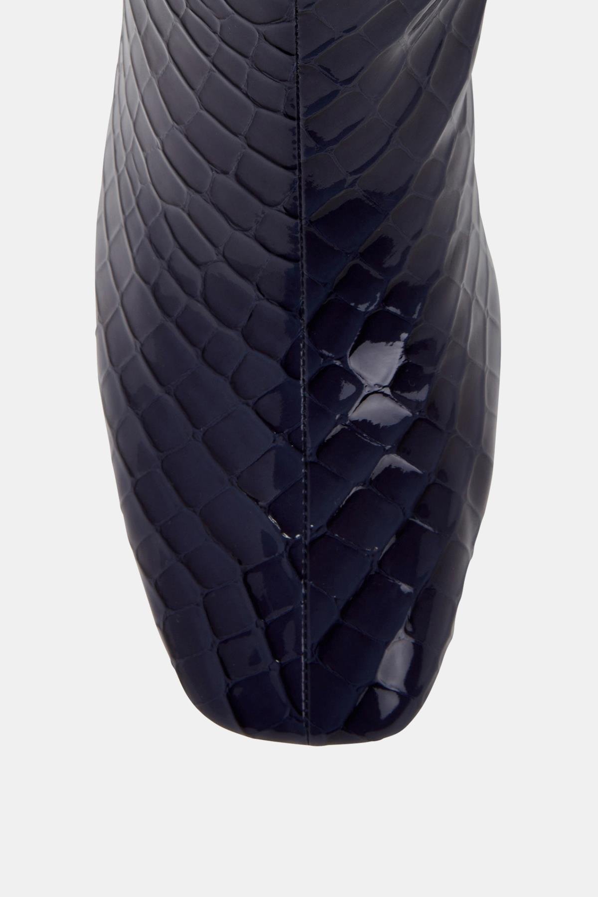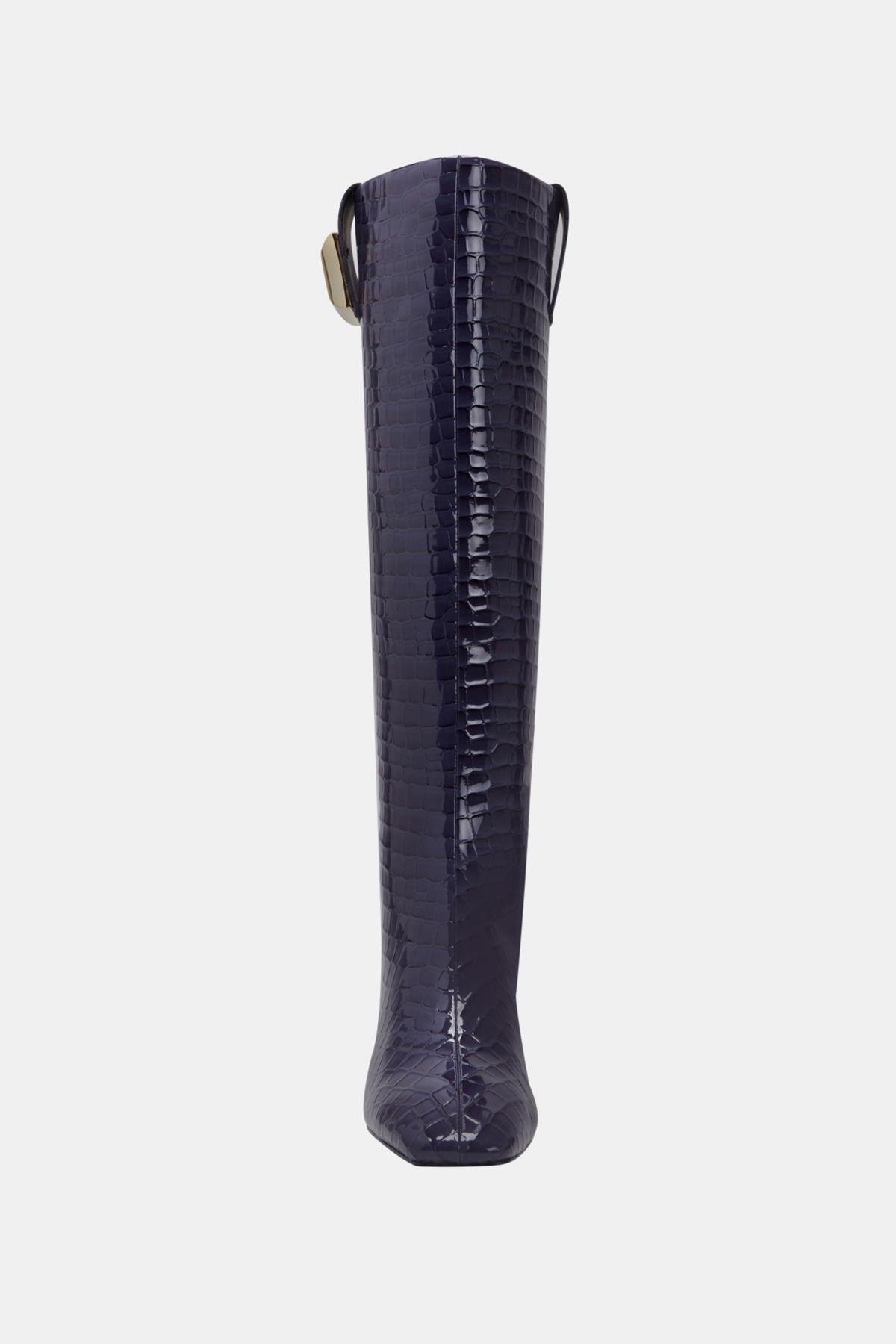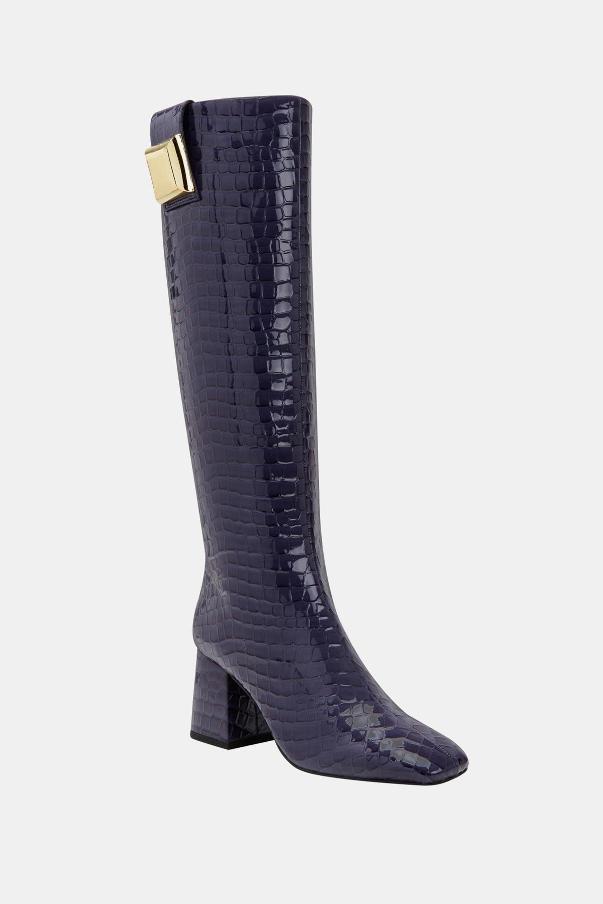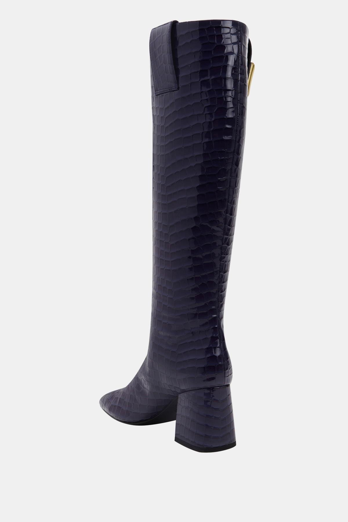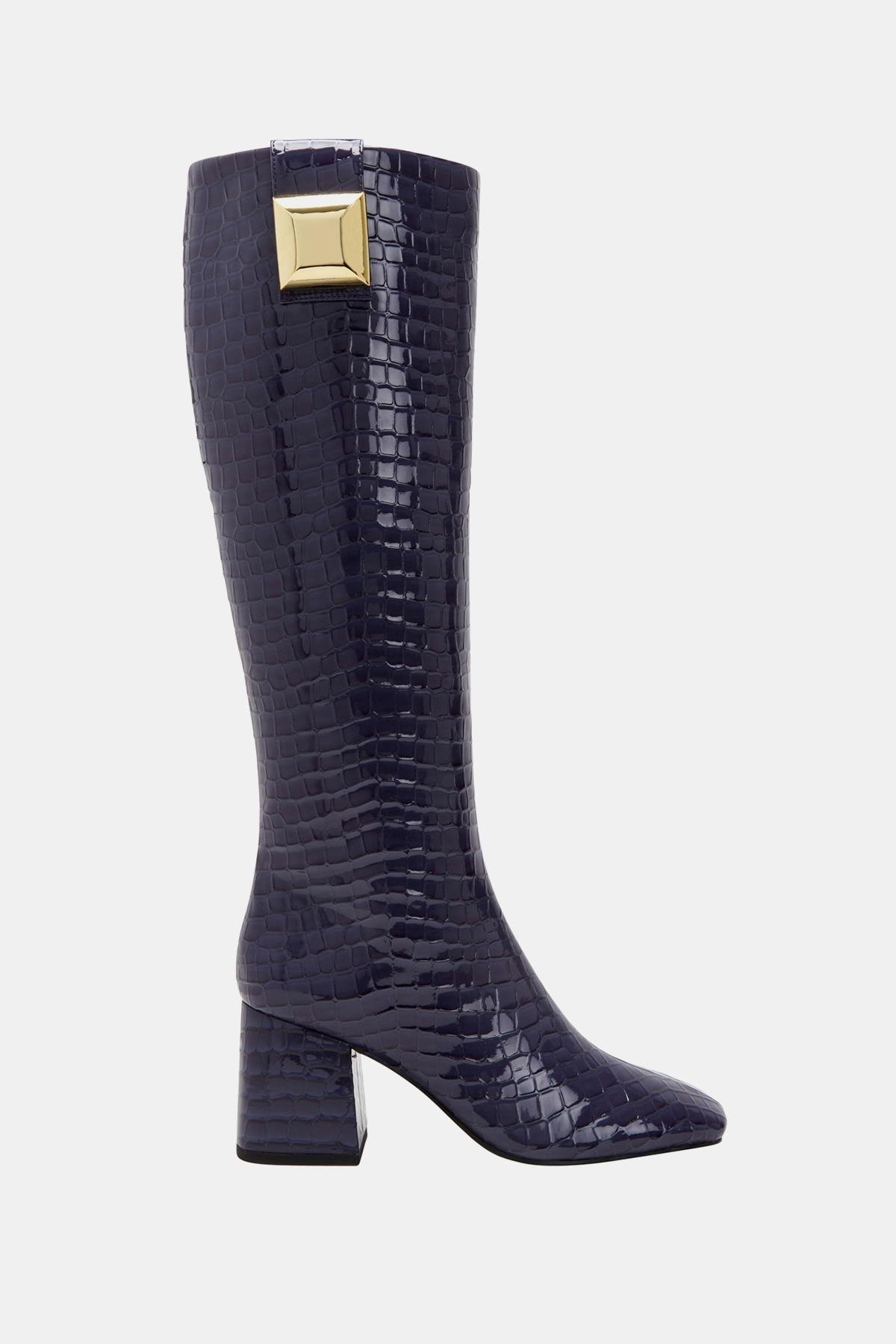 Katy Perry Geminni Kadın Lacivert Croco Topuklu Çizme, modaya uygun tasarımı ve dikkat çekici detayları ile her ortamda stilinizi ön plana çıkarıyor. Lacivert croco deseni, çizmenin zarif ve sofistike görünümüne katkıda bulunurken, metalik kare detaylar çizmeye modern bir hava katıyor. Bu çizme, ofis şıklığından gece davetlerine kadar her türlü etkinlikte sizi şıklığıyla öne çıkaracak.