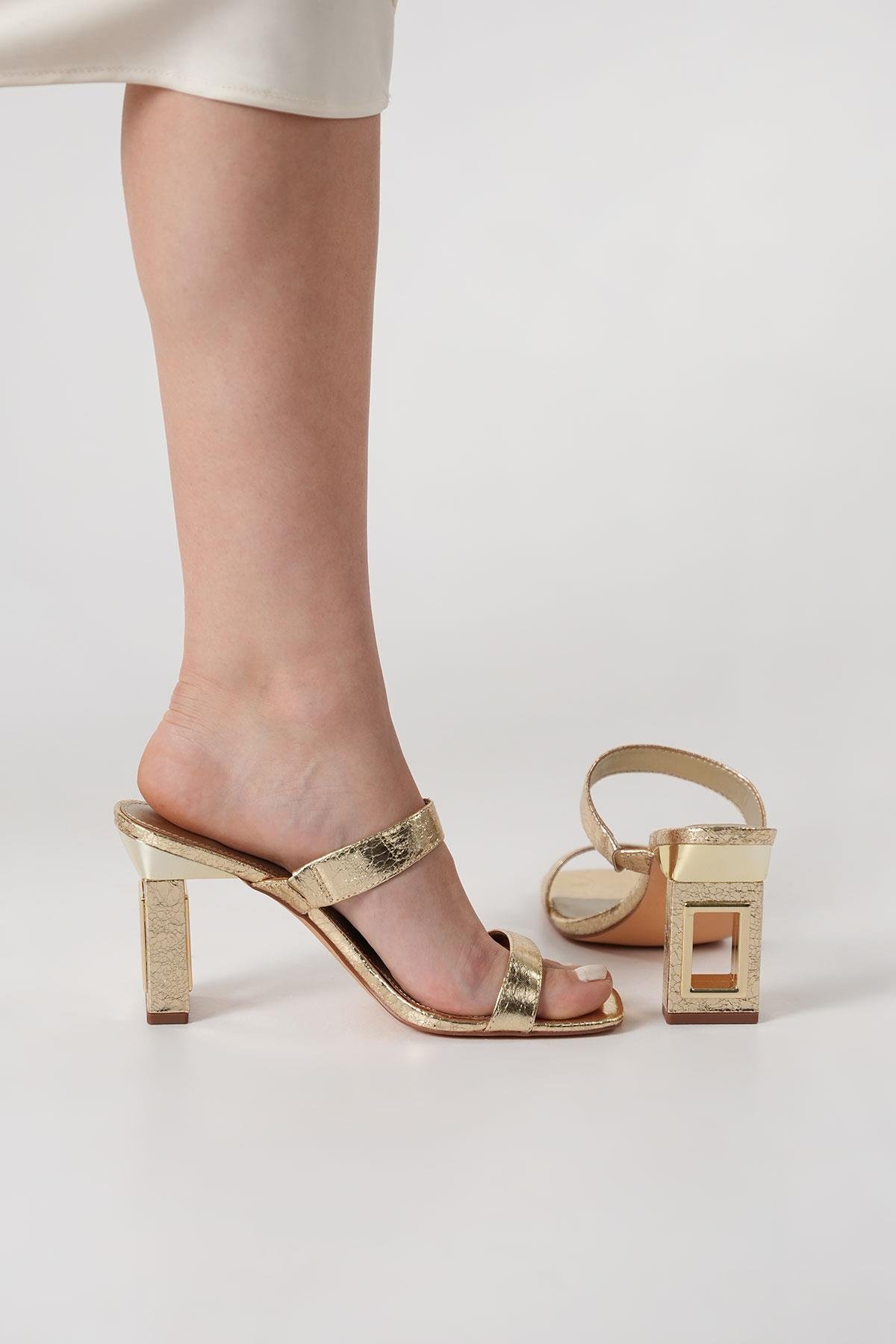 Katy Perry'nin Mirror Nappa malzemesiyle tasarlanan Hollow Sandalet, konfor ve stili birleştiren orta blok topuğa sahiptir ve demir oyuk topuk detayı ile desteklenmiştir..