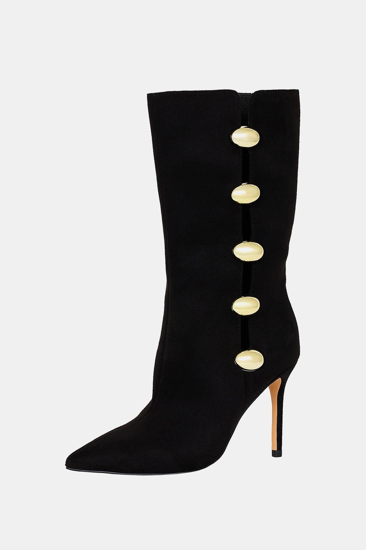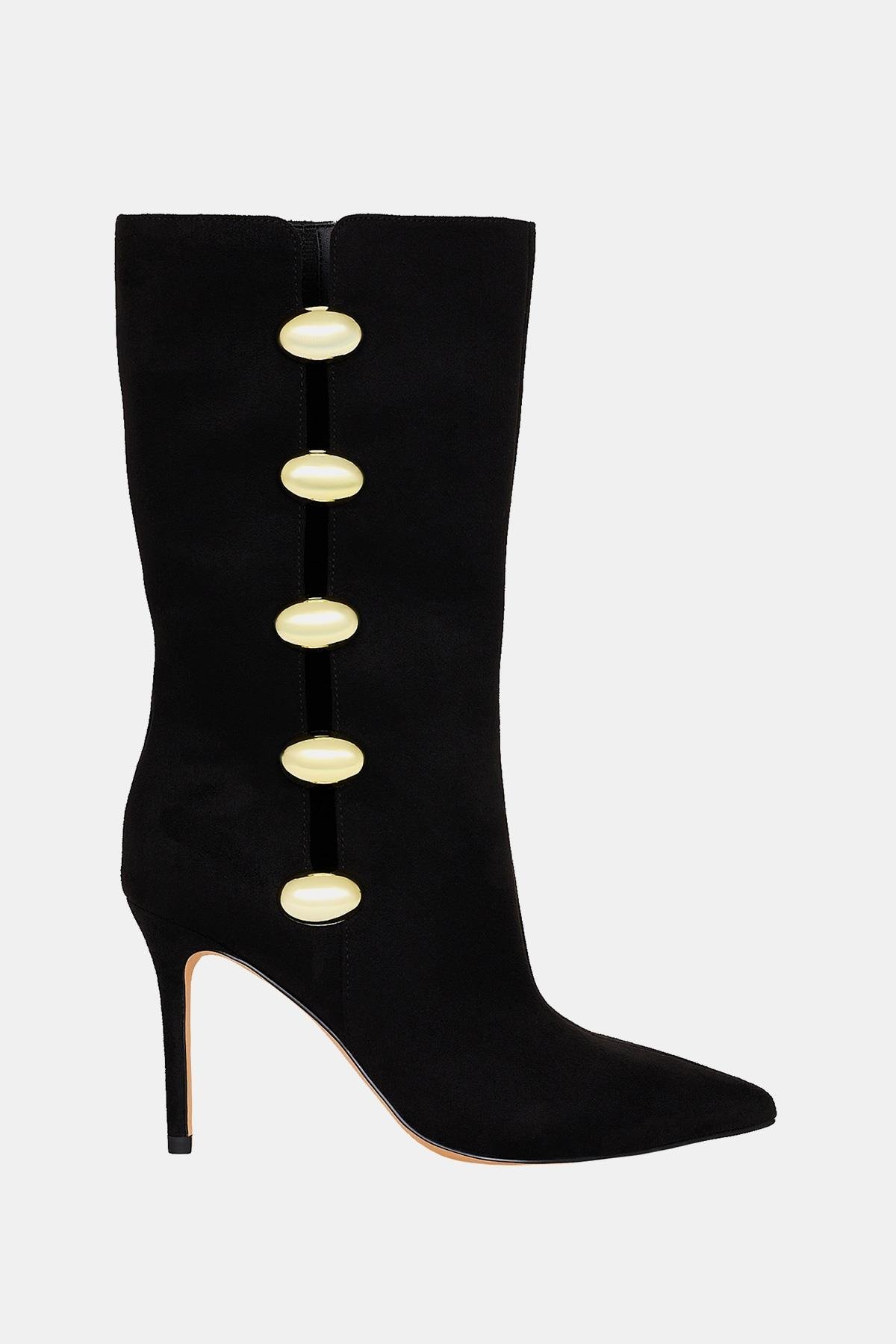 • Detaylar: 9 cm yüksek topuk, zarif bir duruş sağlarken, bacakları ince ve uzun gösterir. Siyah rengiyle zamansız bir şıklık sunan bu çizme, dekoratif süslemeleriyle modern ve sofistike bir görünüm kazanır.