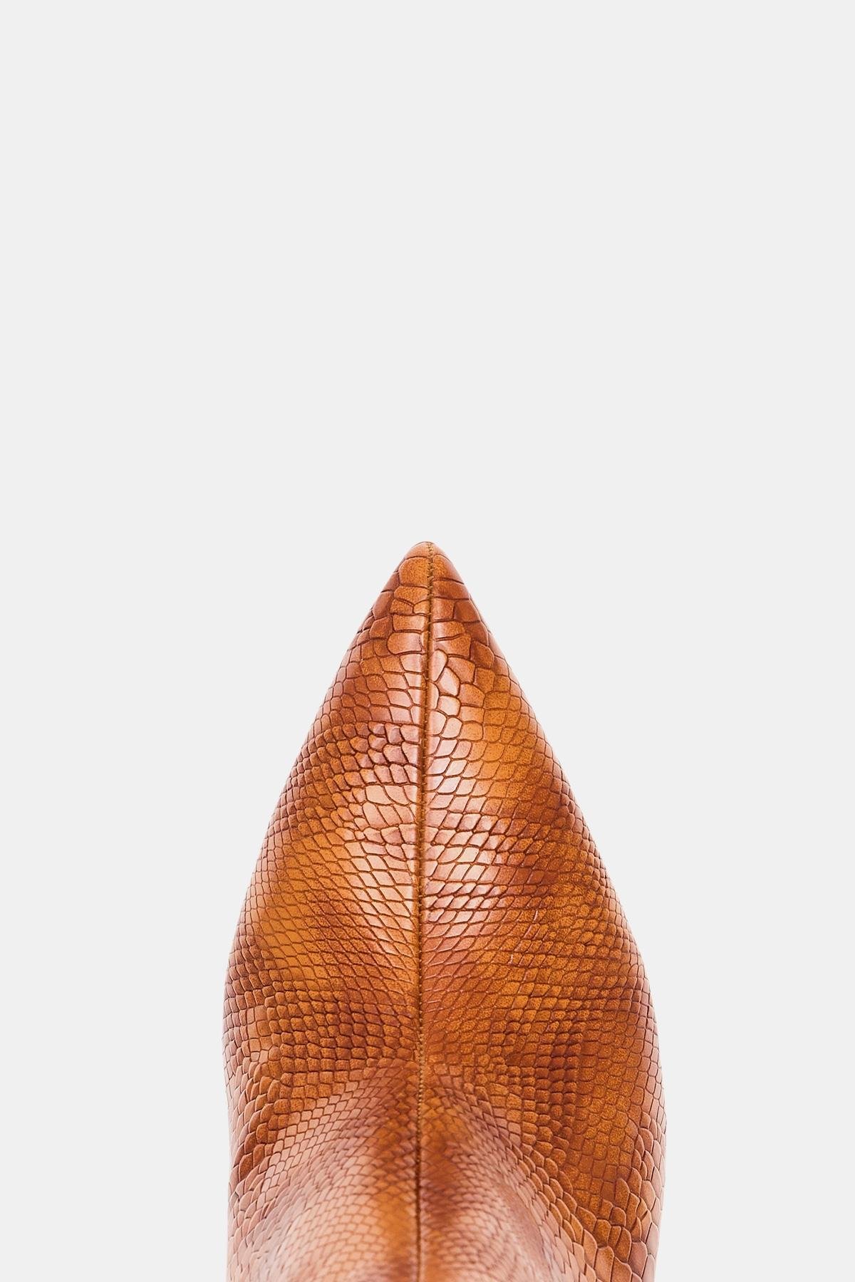 • Detaylar: 9 cm yüksek topuğu, zarif bir duruş ve ekstra boy kazandırır. Taba rengi ve yılan baskısı, çizmeye sofistike ve göz alıcı bir hava katar. Ornamental süslemeleri ile bu çizme, stiline modern ve özgün bir dokunuş kazandırır.