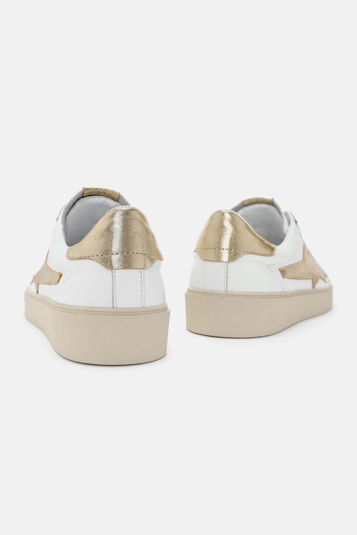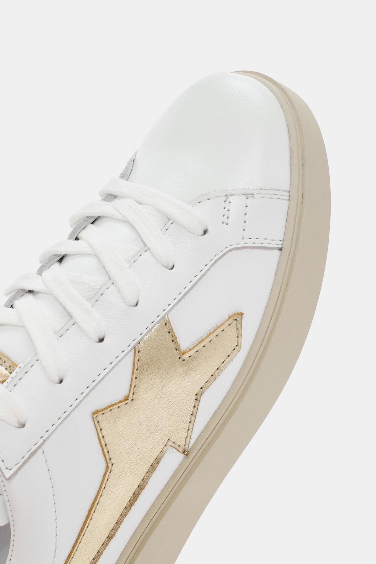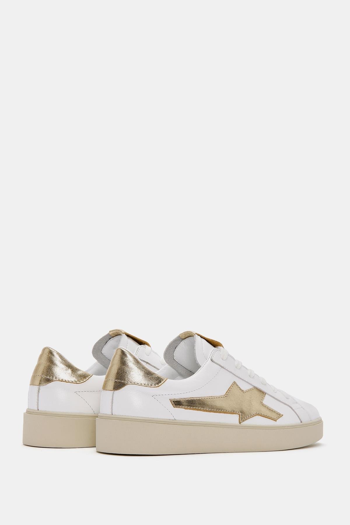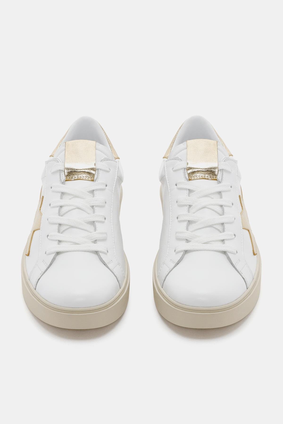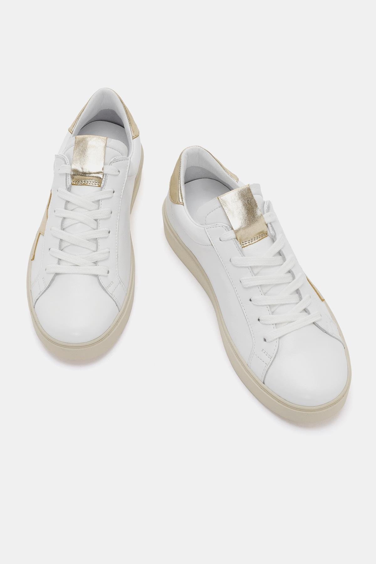 Bu sneaker, yüksek kaliteli deri malzemesi ve dayanıklı tabanıyla uzun süreli konfor sunar. Beyaz ve altın renk detaylarıyla çeşitli kombinlerle uyum sağlar.