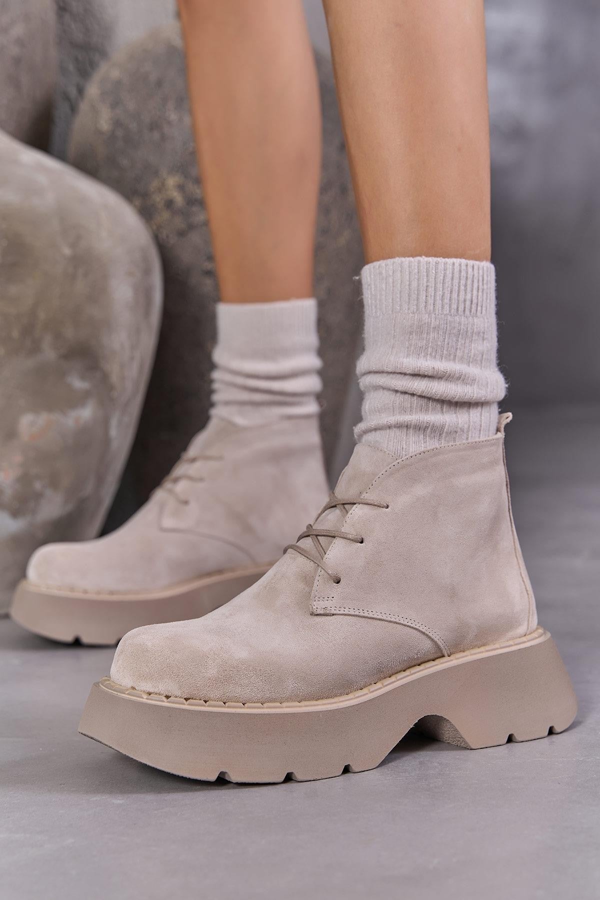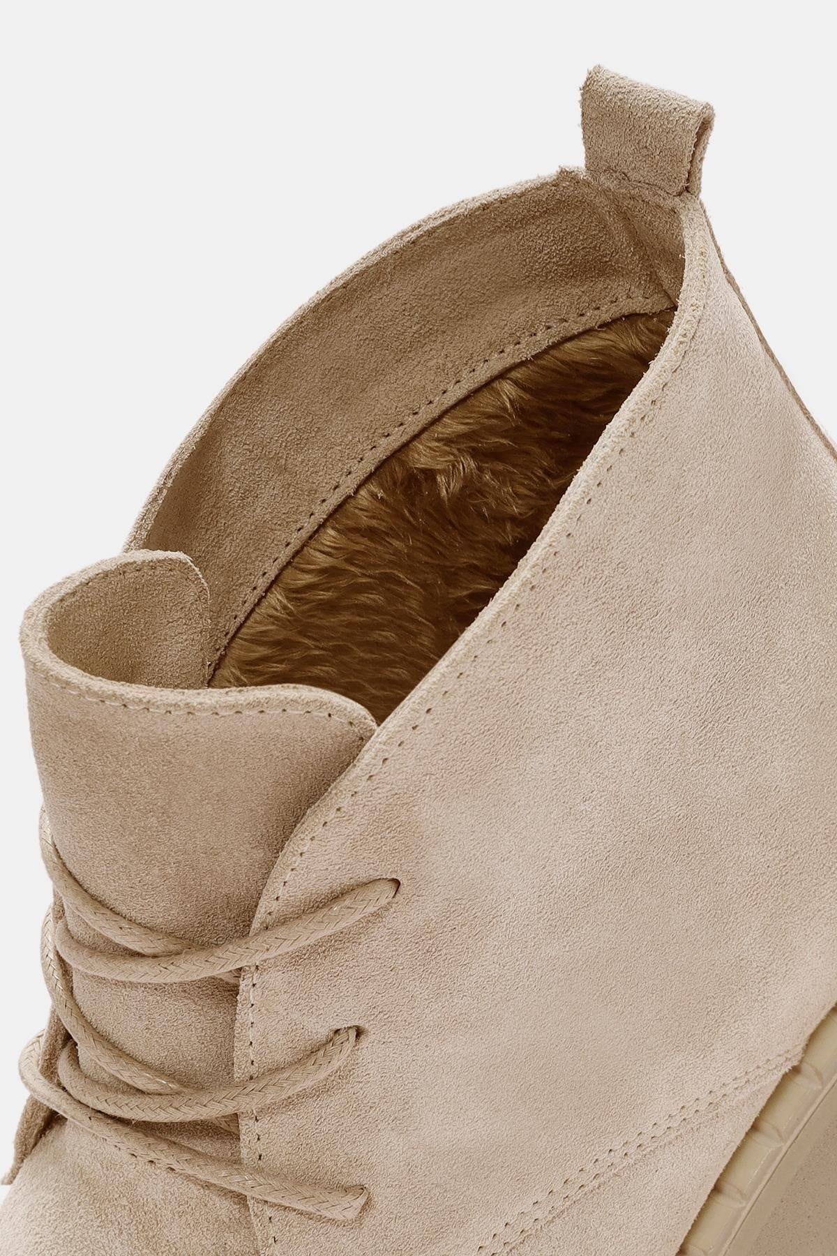 Aniva Kadın Bej İçi Kürklü Gerçek Süet Deri Kalın Tabanlı Bot