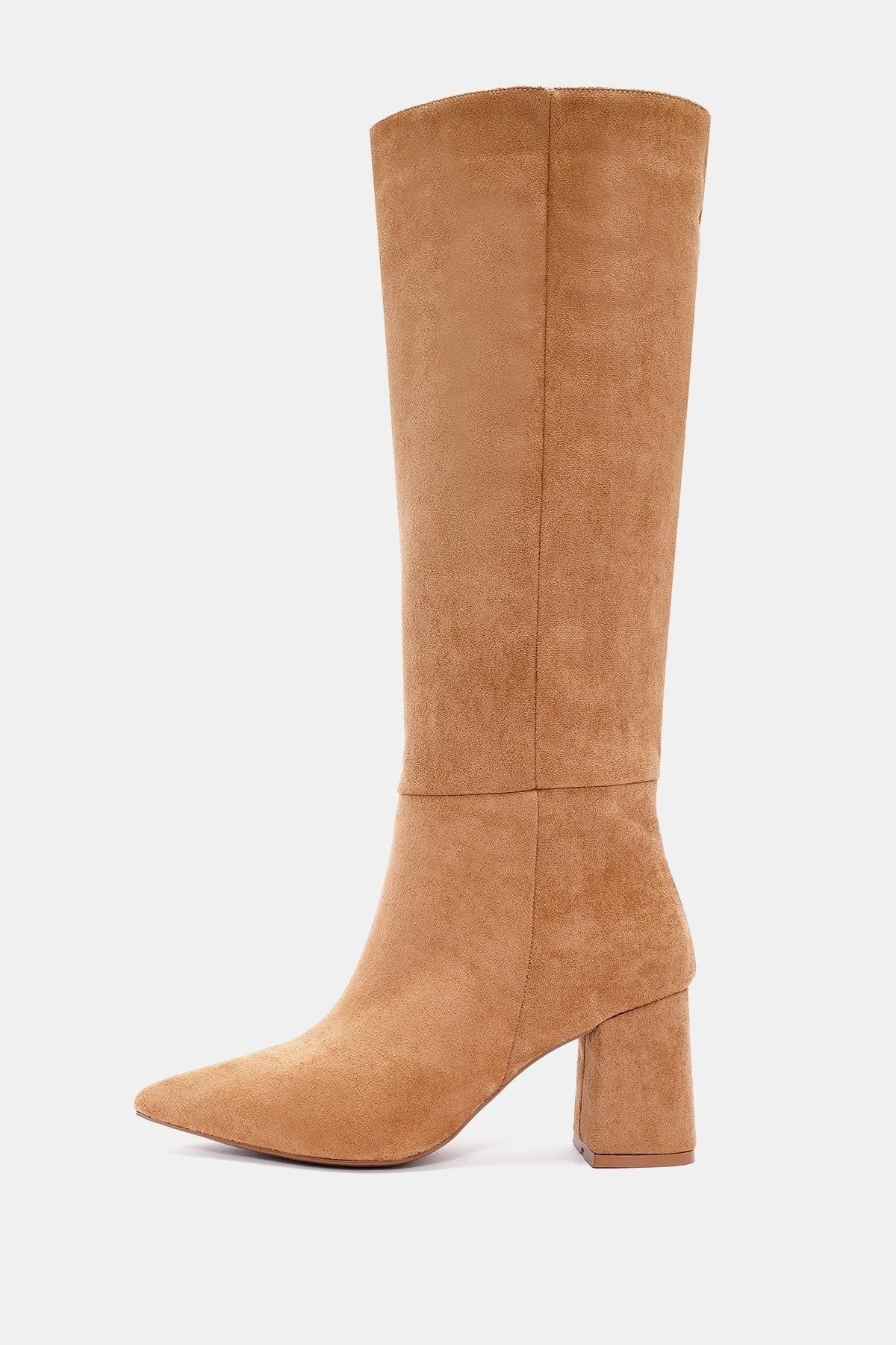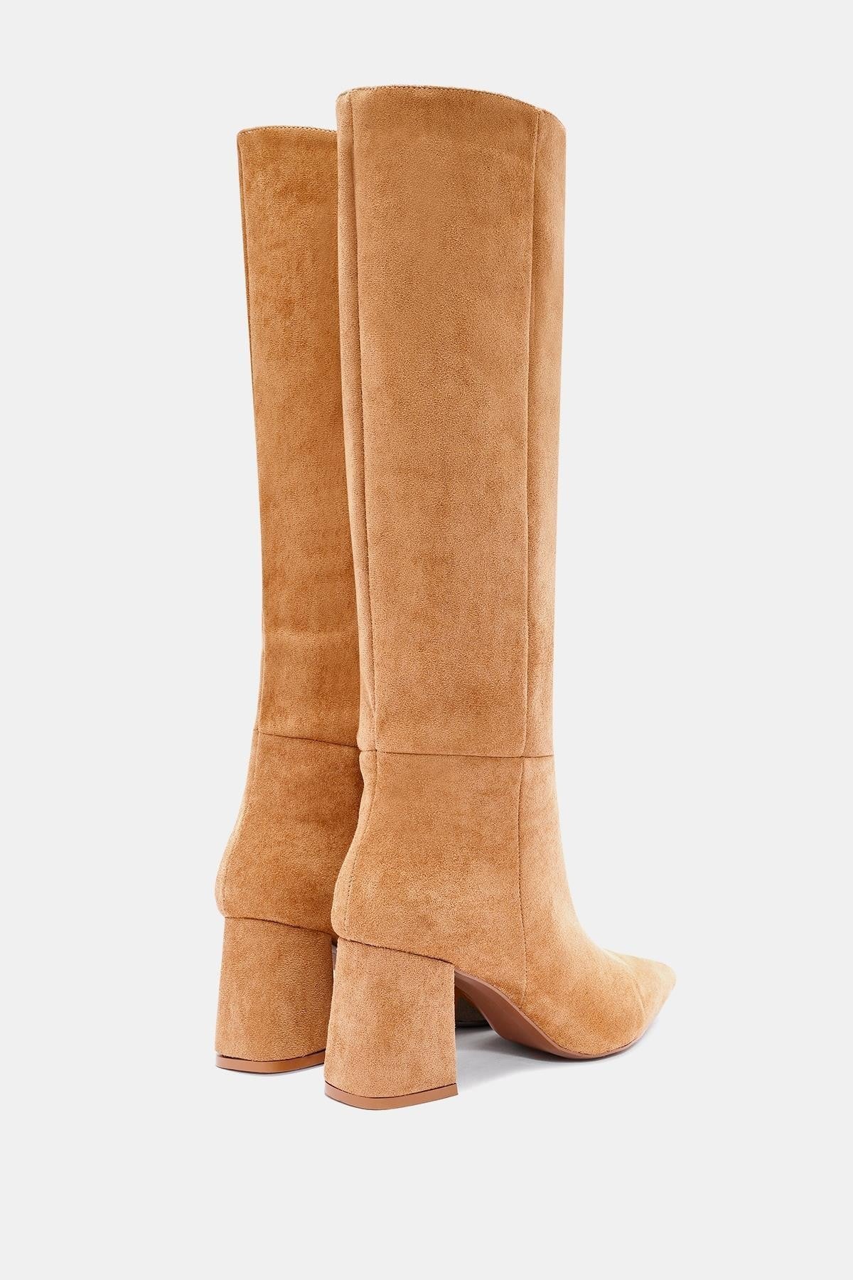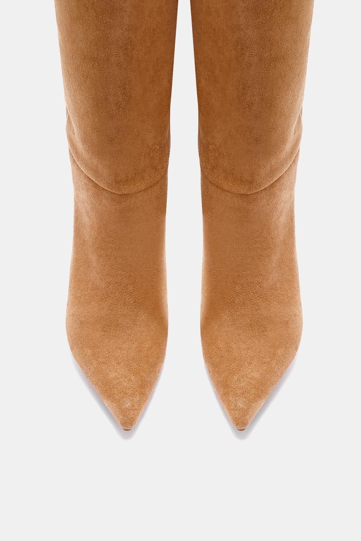 Teknik: Camel renkli, sivri burunlu, uzun suni süet çizme. Günlük kullanımda ve özel davetlerde şıklık sağlar.