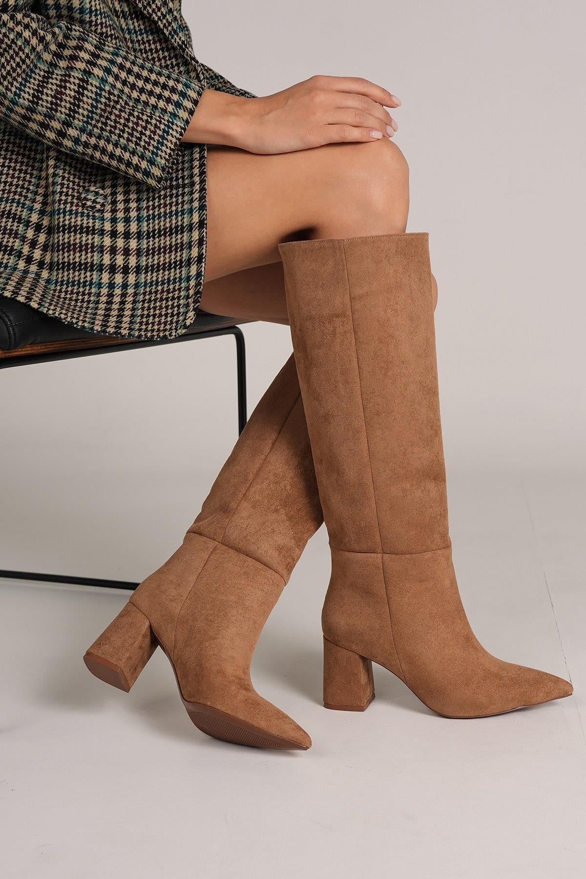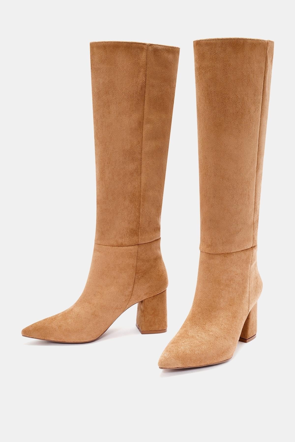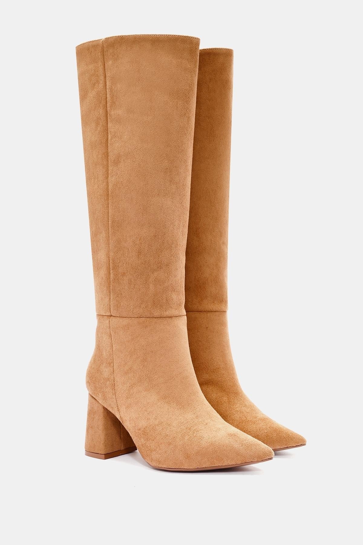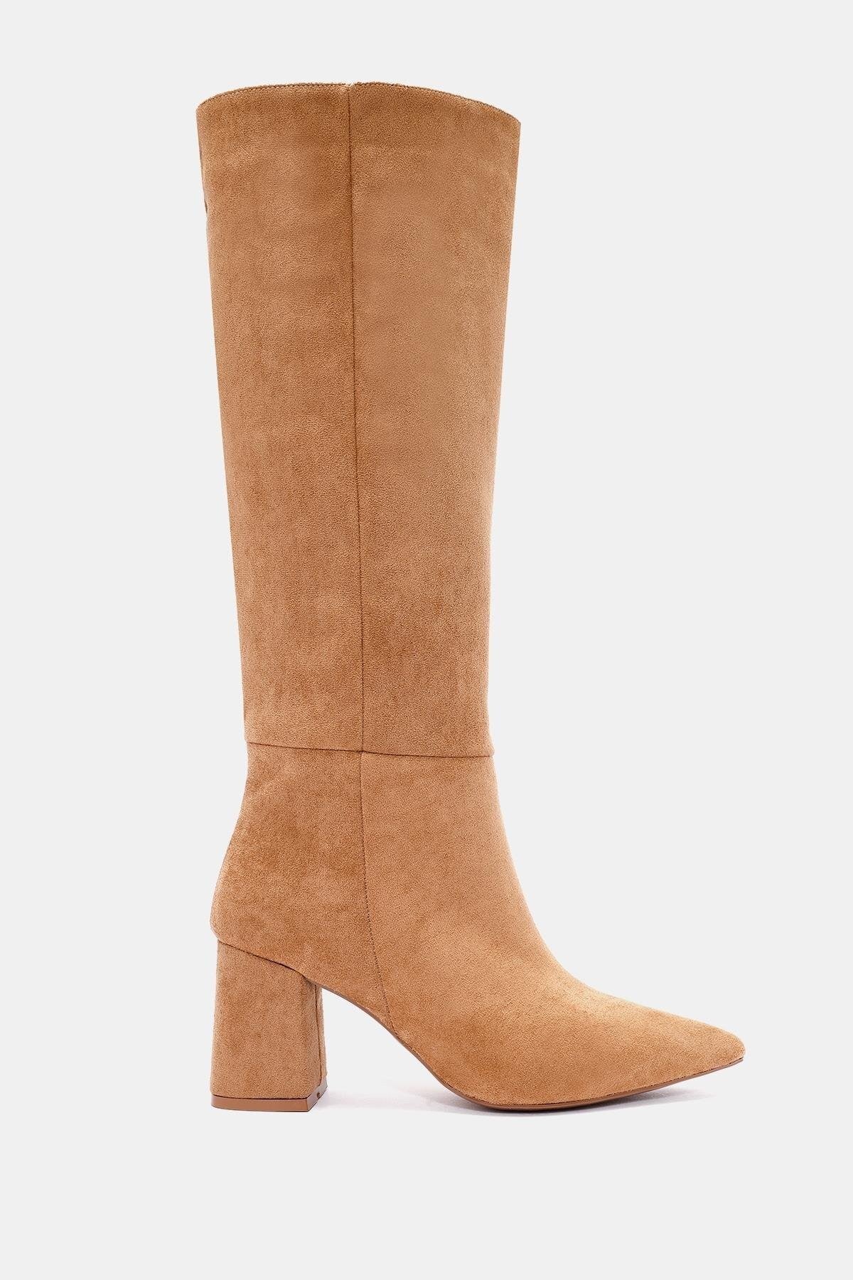 Teknik: Camel renkli, sivri burunlu, uzun suni süet çizme. Günlük kullanımda ve özel davetlerde şıklık sağlar.