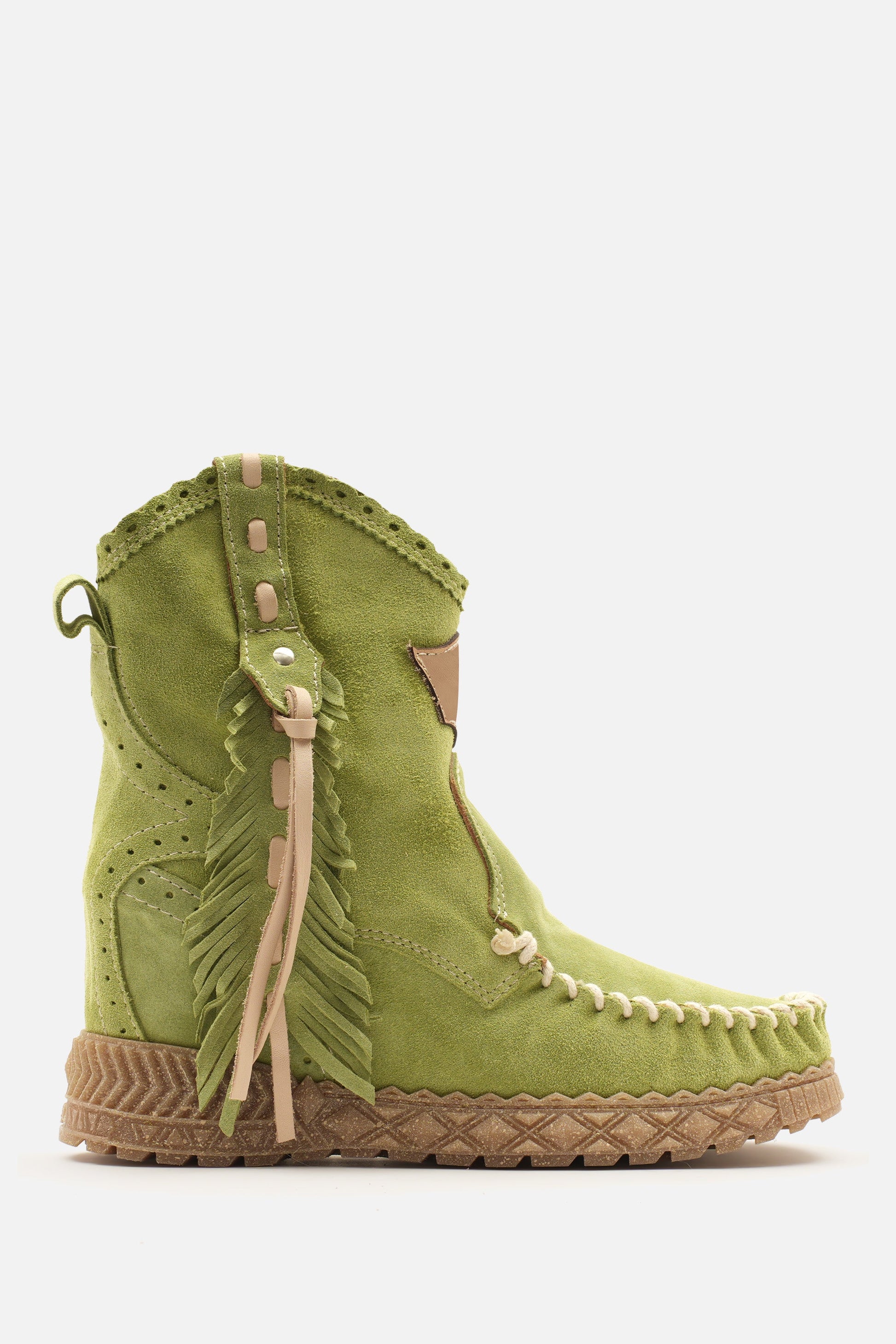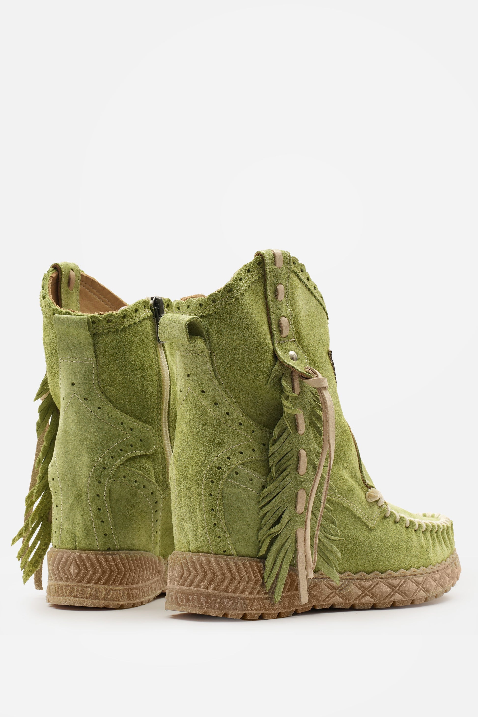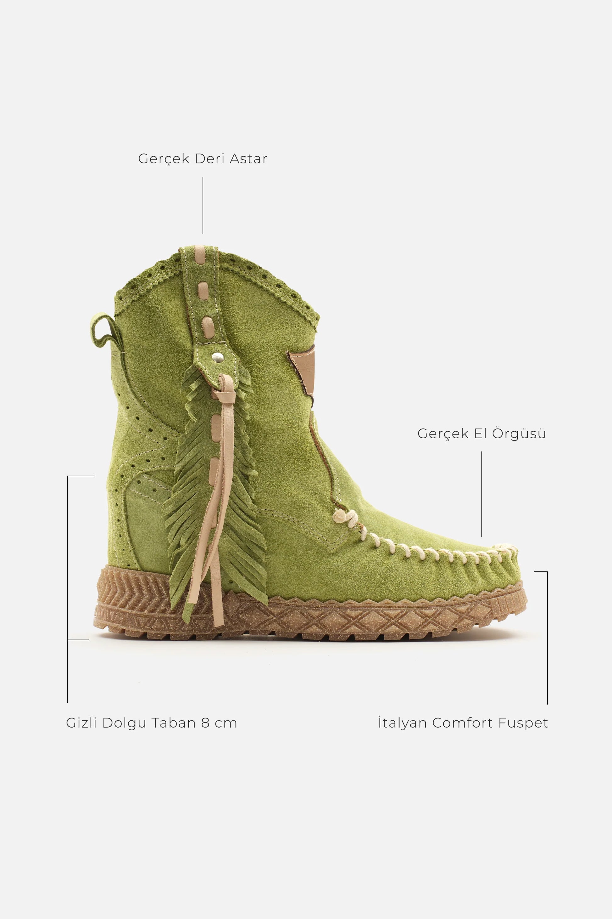 Kalın el dikişli burun kısmı, 7 cm'lik iç topuk yüksekliği ve onu eşsiz kılan güzel tüy şeklindeki yan detaylarıyla öne çıkan mokasen bilek botlarımızdan biridir. Ünlü Silverstone yıkama işlemiyle zenginleştirilmiş, vintage görünümlü süet dana derisinden üretilmiştir. Her bir deri, zengin tonları ve hikaye anlatan eskimiş görünümüyle benzersizdir.