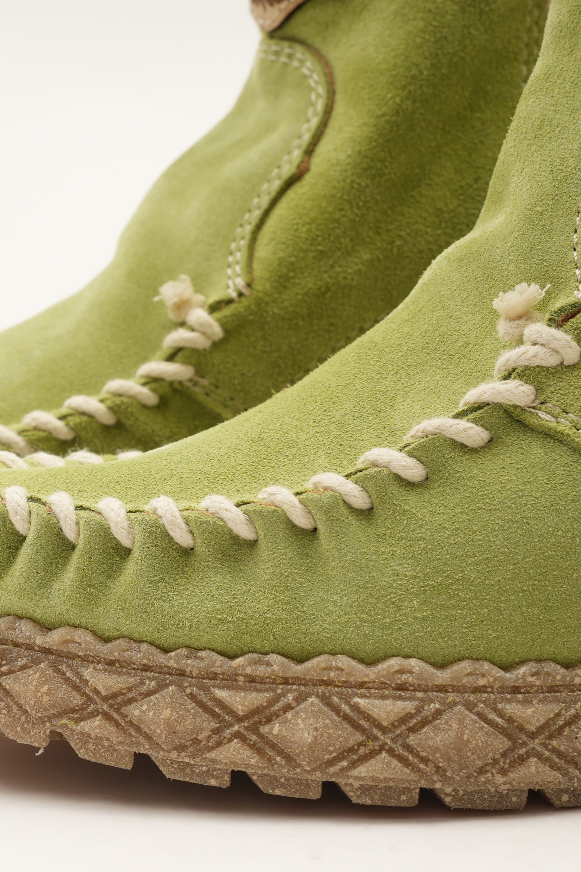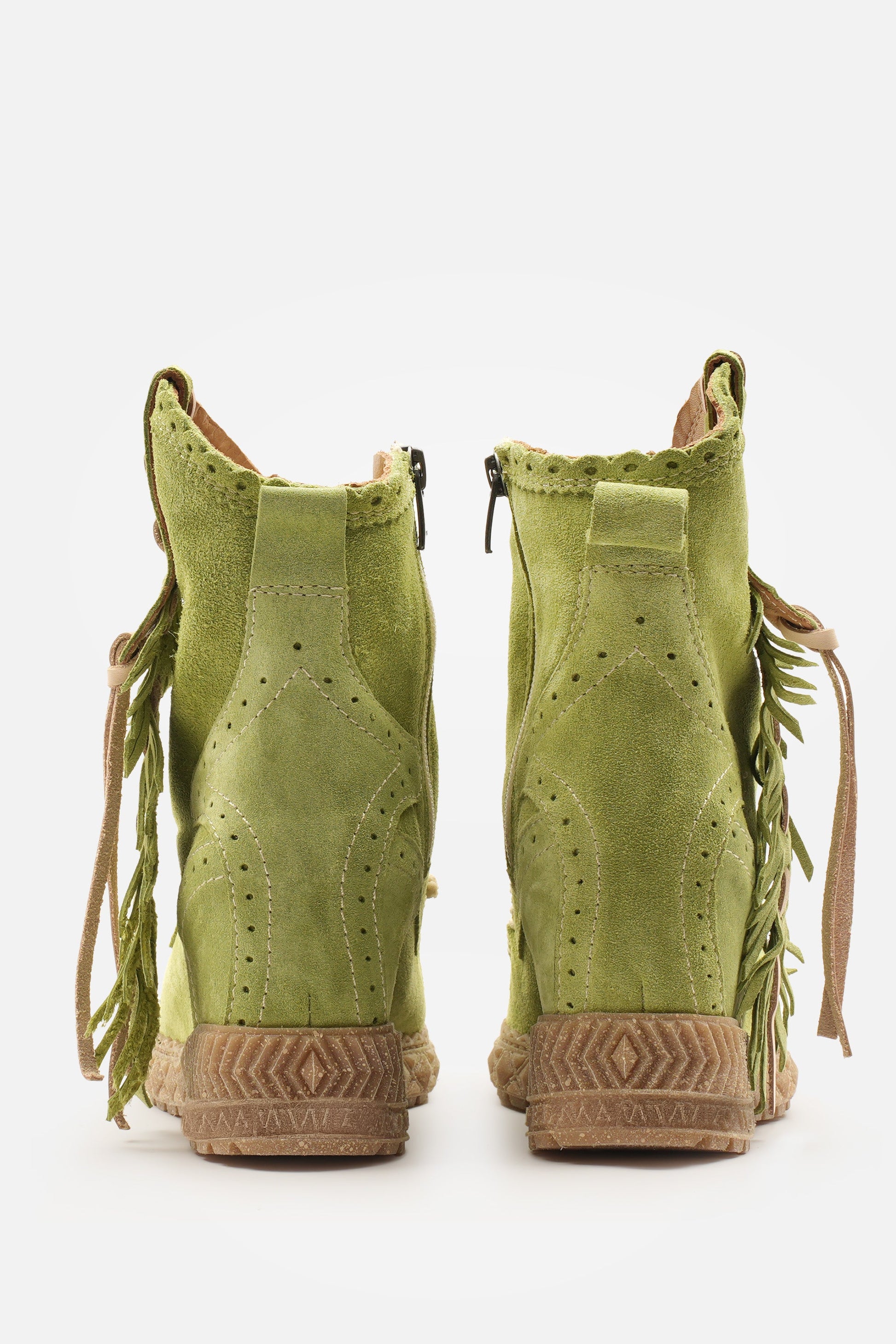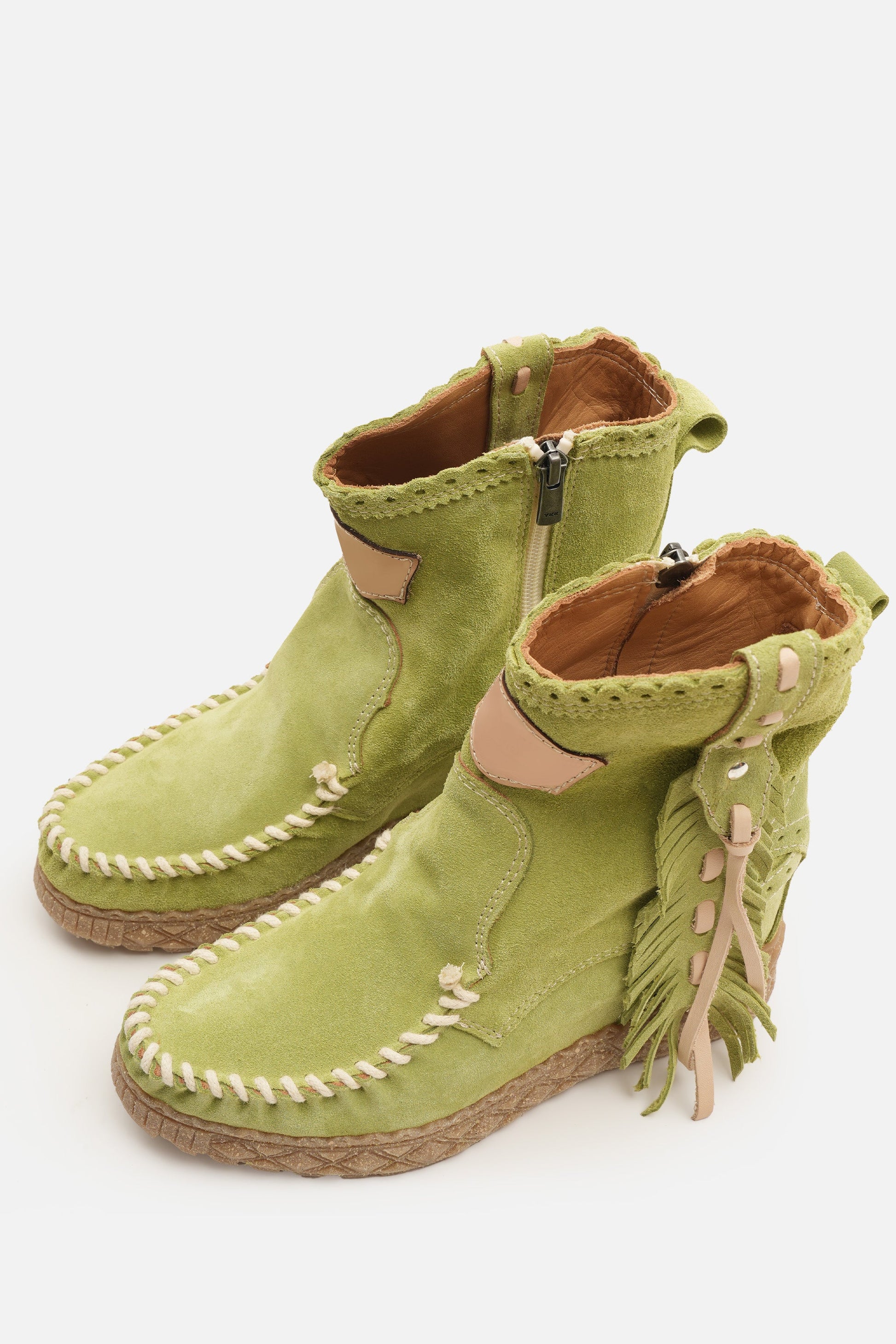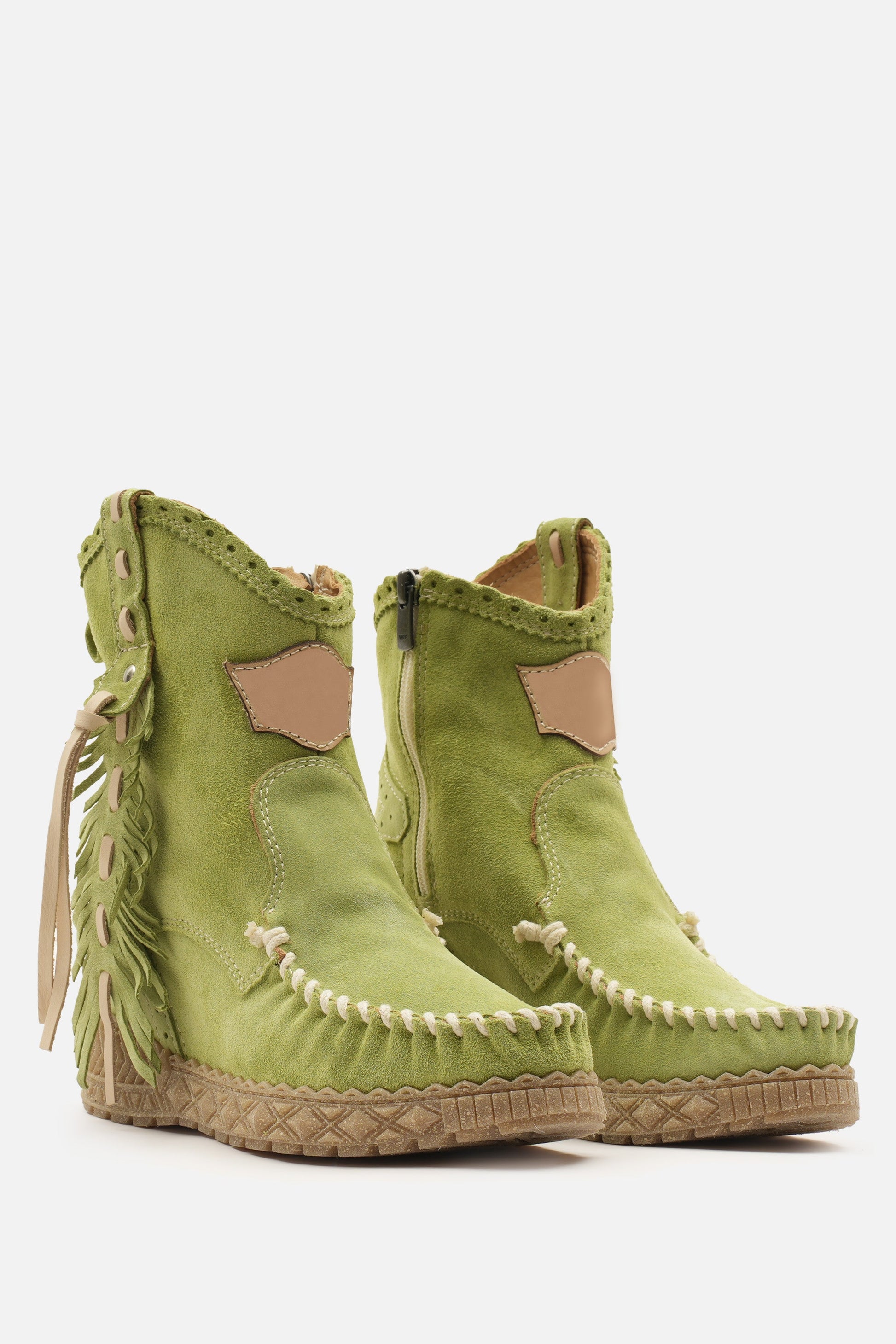 Kalın el dikişli burun kısmı, 7 cm'lik iç topuk yüksekliği ve onu eşsiz kılan güzel tüy şeklindeki yan detaylarıyla öne çıkan mokasen bilek botlarımızdan biridir. Ünlü Silverstone yıkama işlemiyle zenginleştirilmiş, vintage görünümlü süet dana derisinden üretilmiştir. Her bir deri, zengin tonları ve hikaye anlatan eskimiş görünümüyle benzersizdir.