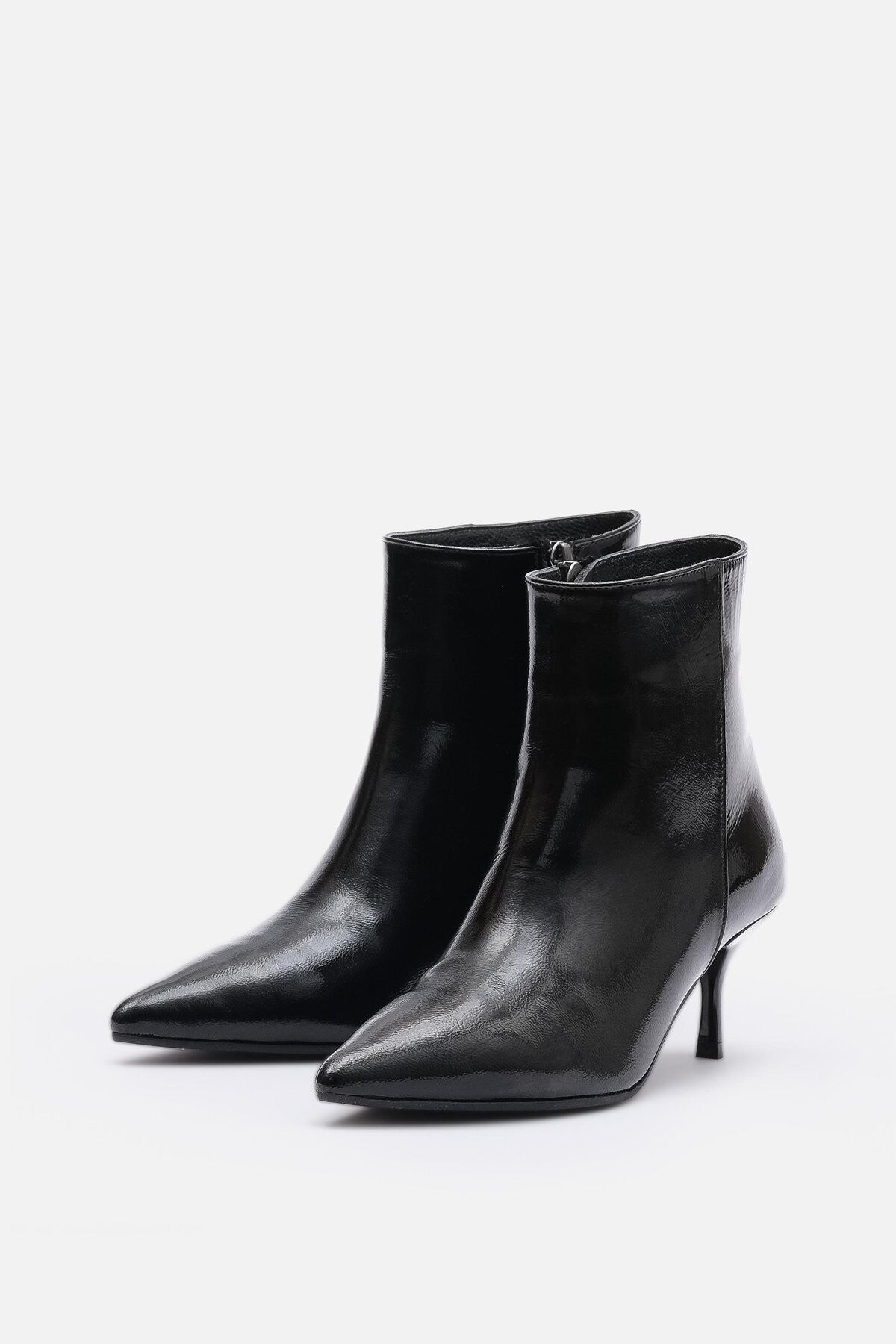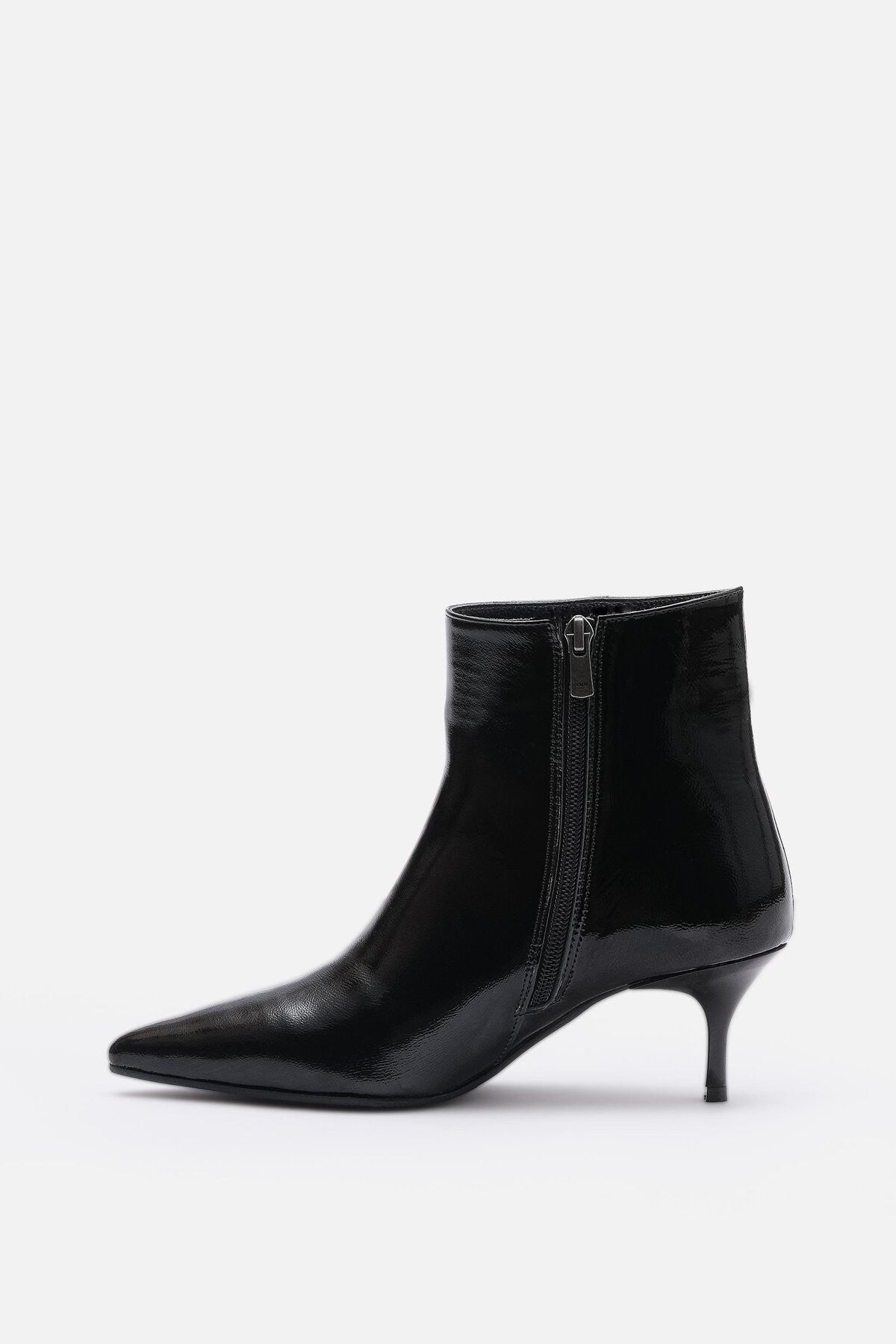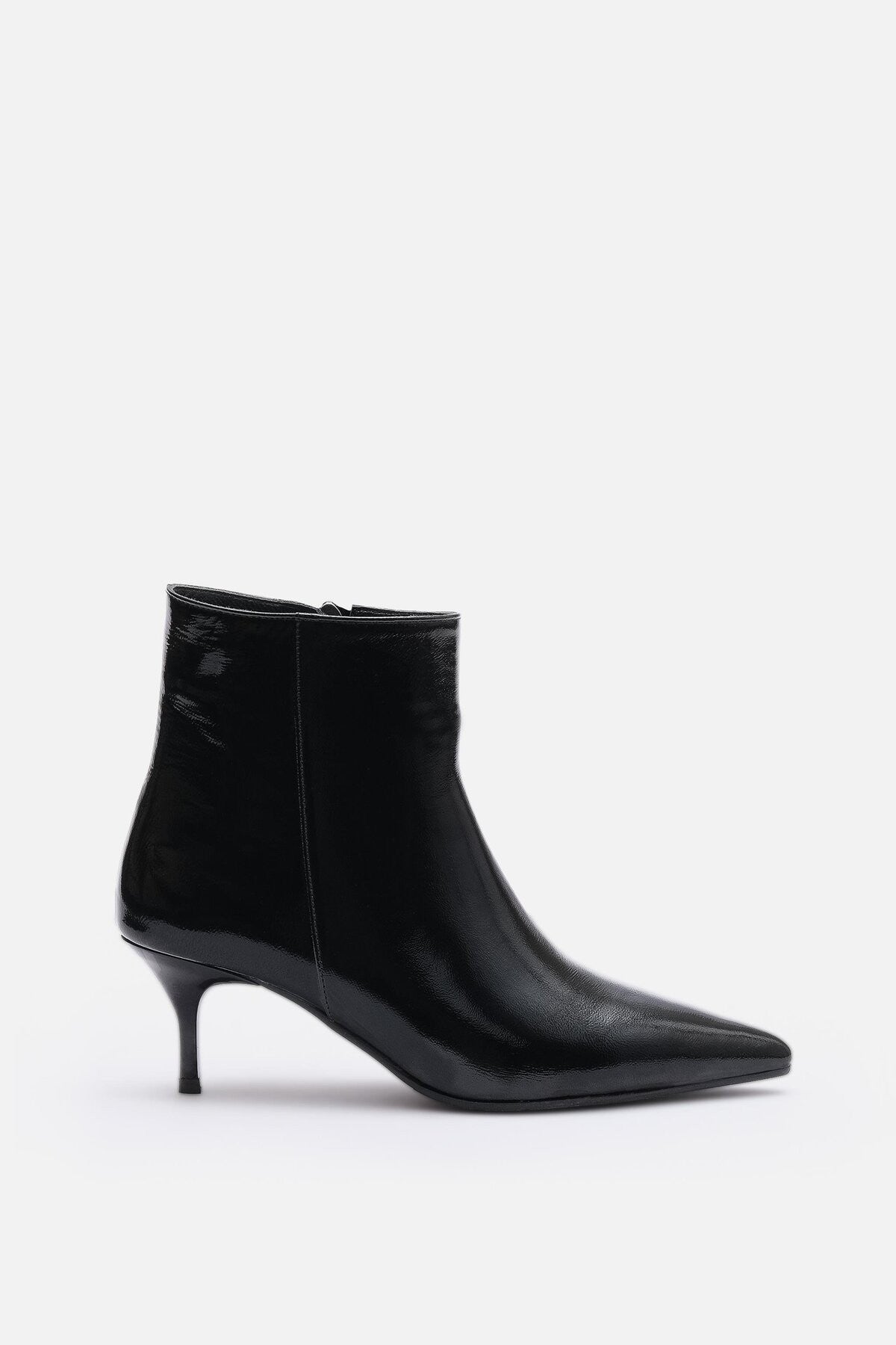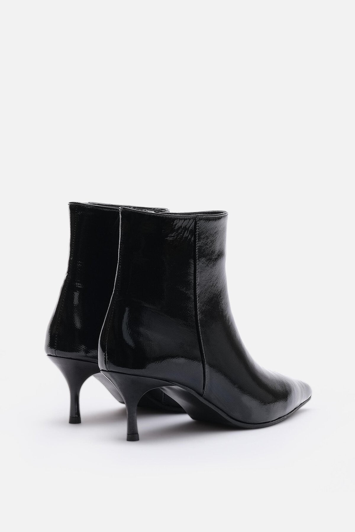 Teknik: Siyah renkli, sivri burunlu topuklu ayakkabı. Yan fermuar detayı sayesinde pratik kullanım sağlar, gece şıklığından ofis kombinlerine kadar uygundur.