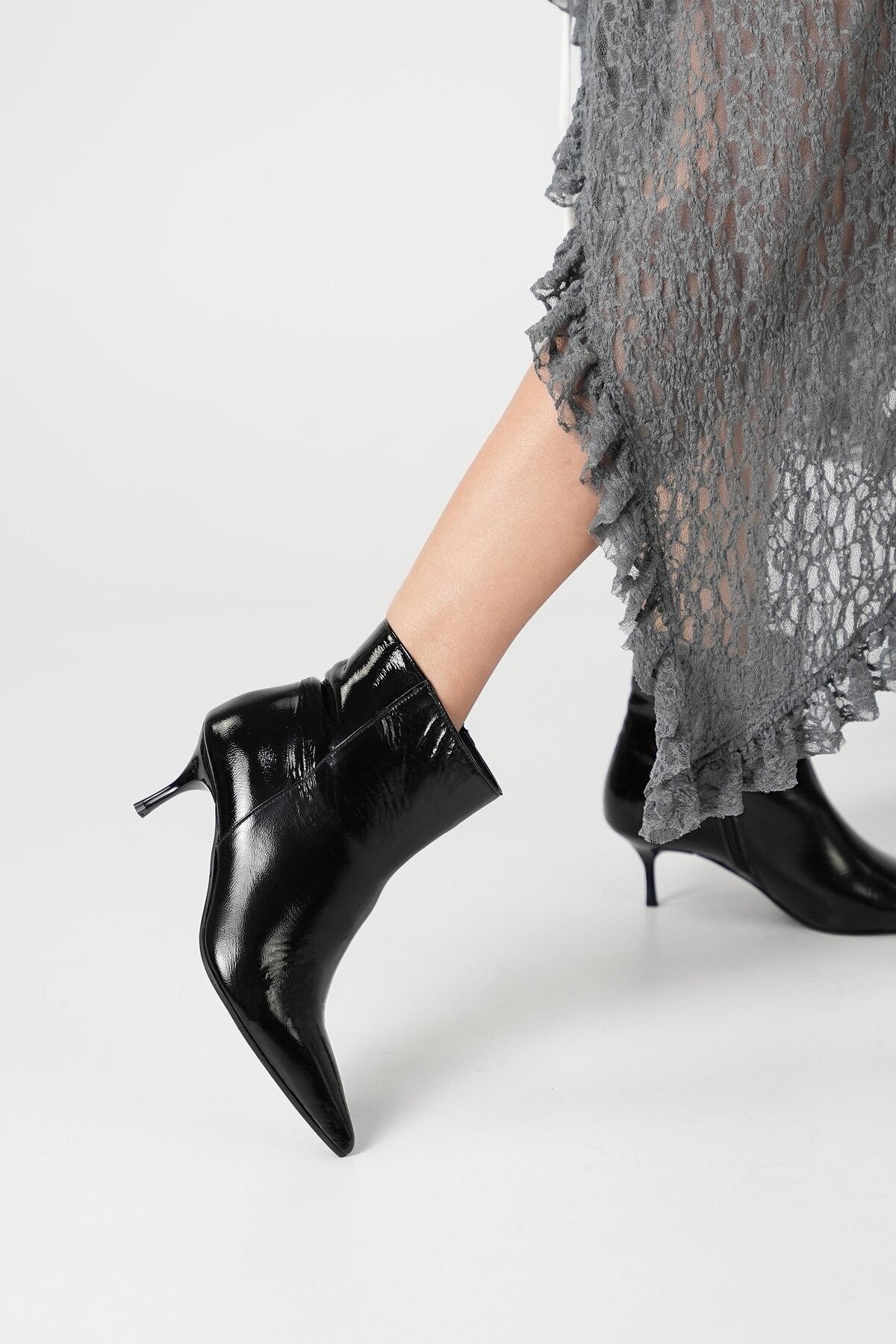NOIR Kadın Siyah Gerçek Rugan Deri İnce Topuklu Fermuarlı Bot