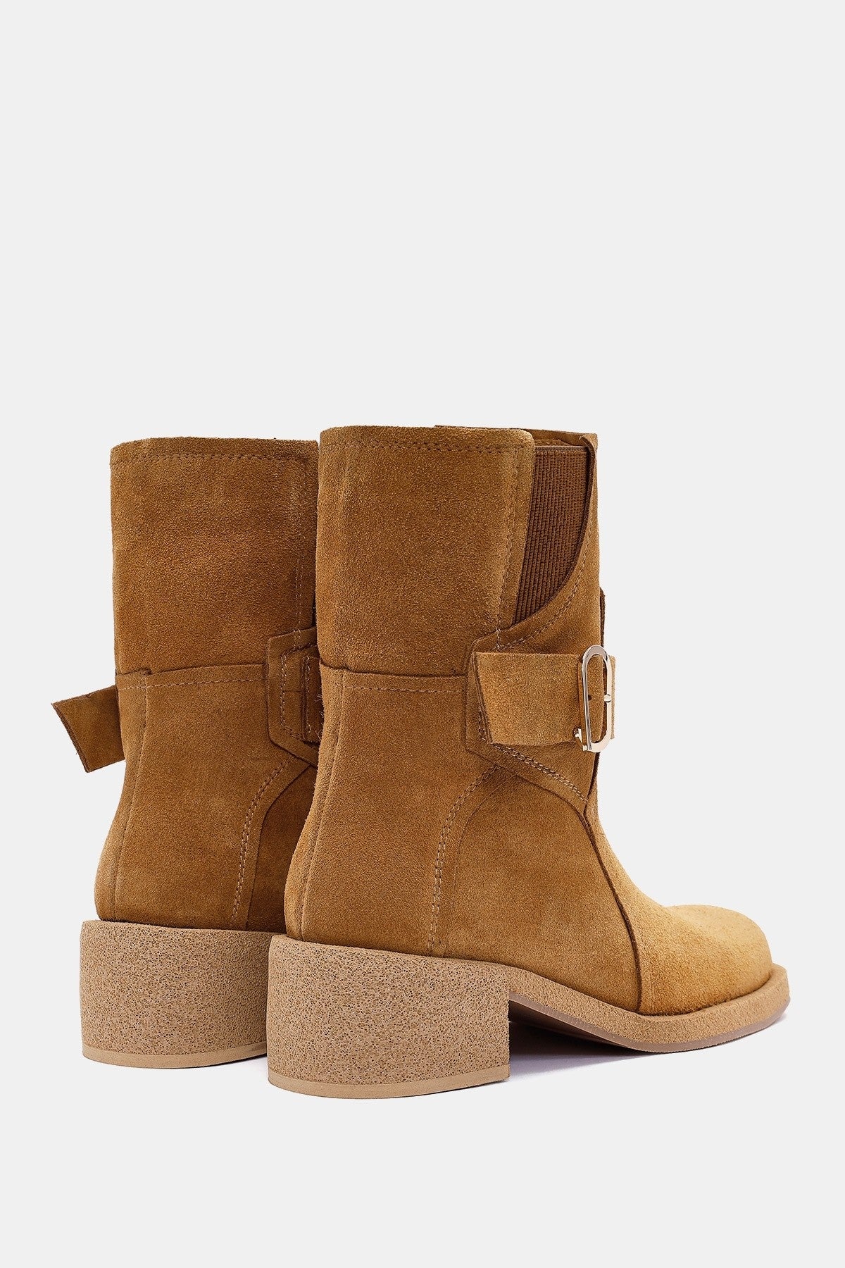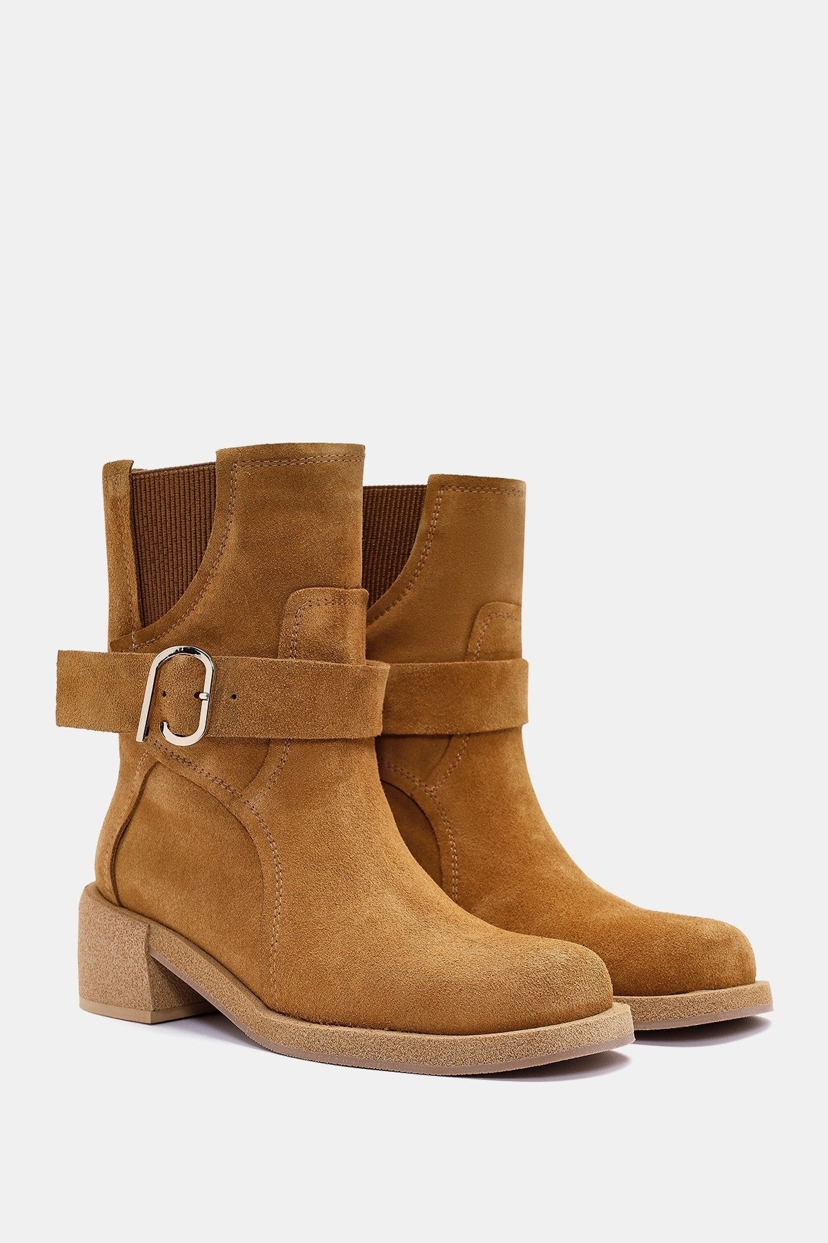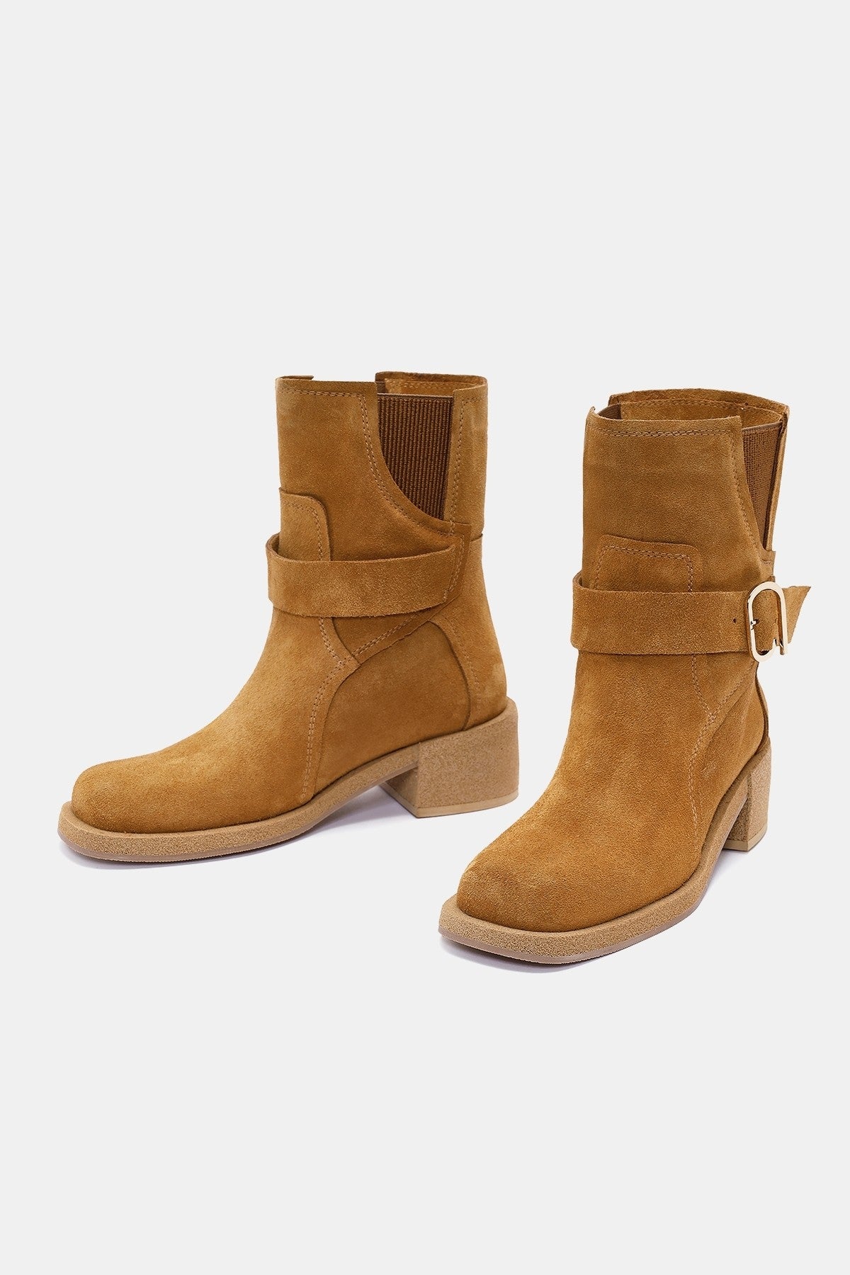 Rafles Kadın Camel Gerçek Süet Deri Toka Detaylı Kalın Topuklu Bot