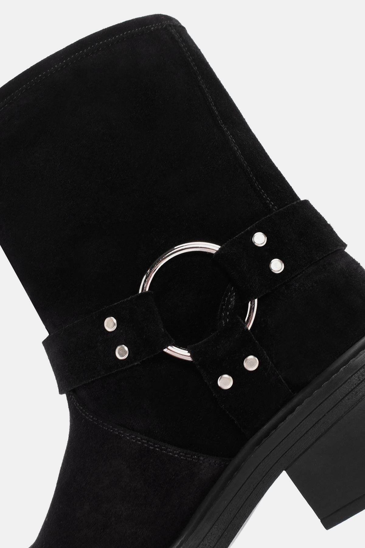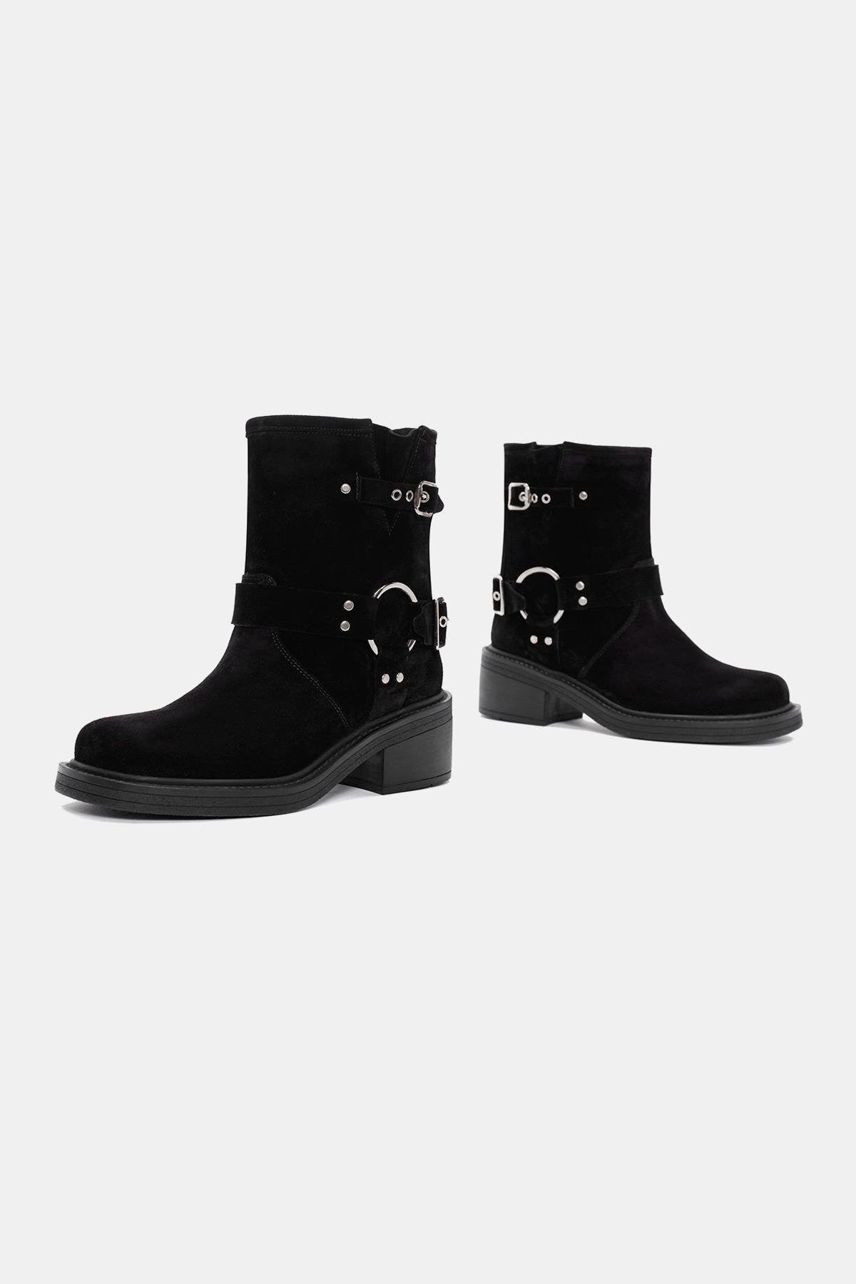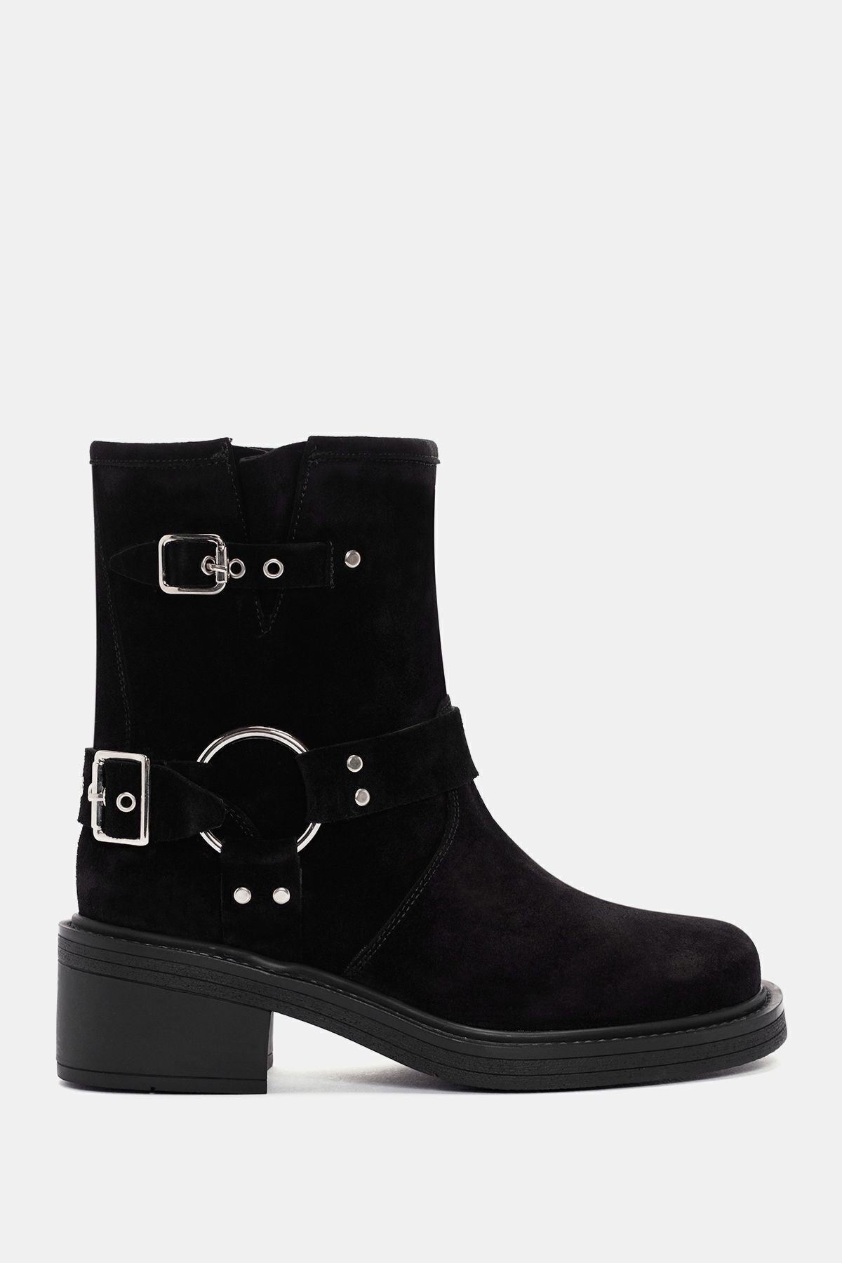 Teknik: Siyah renkli, toka detaylı süet deri bot. Günlük ve şık kombinlere güçlü bir stil katar.
