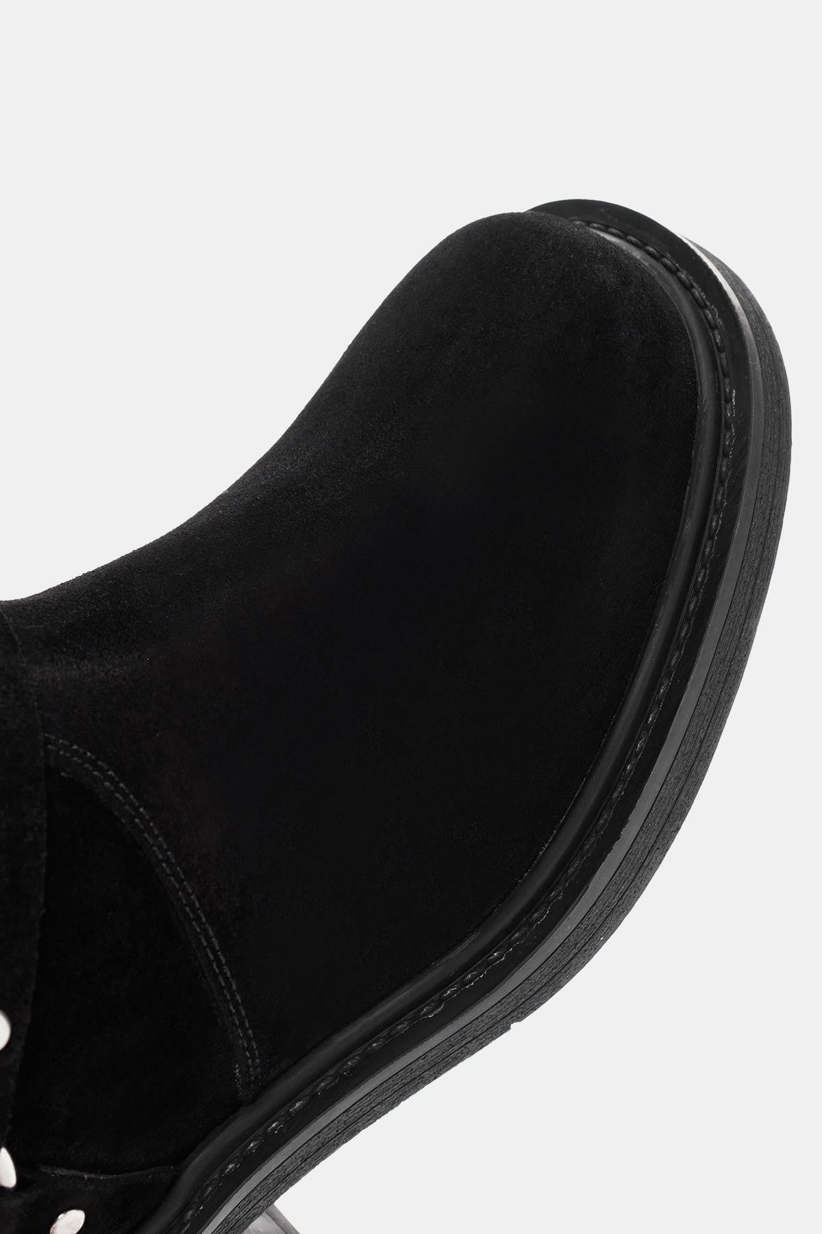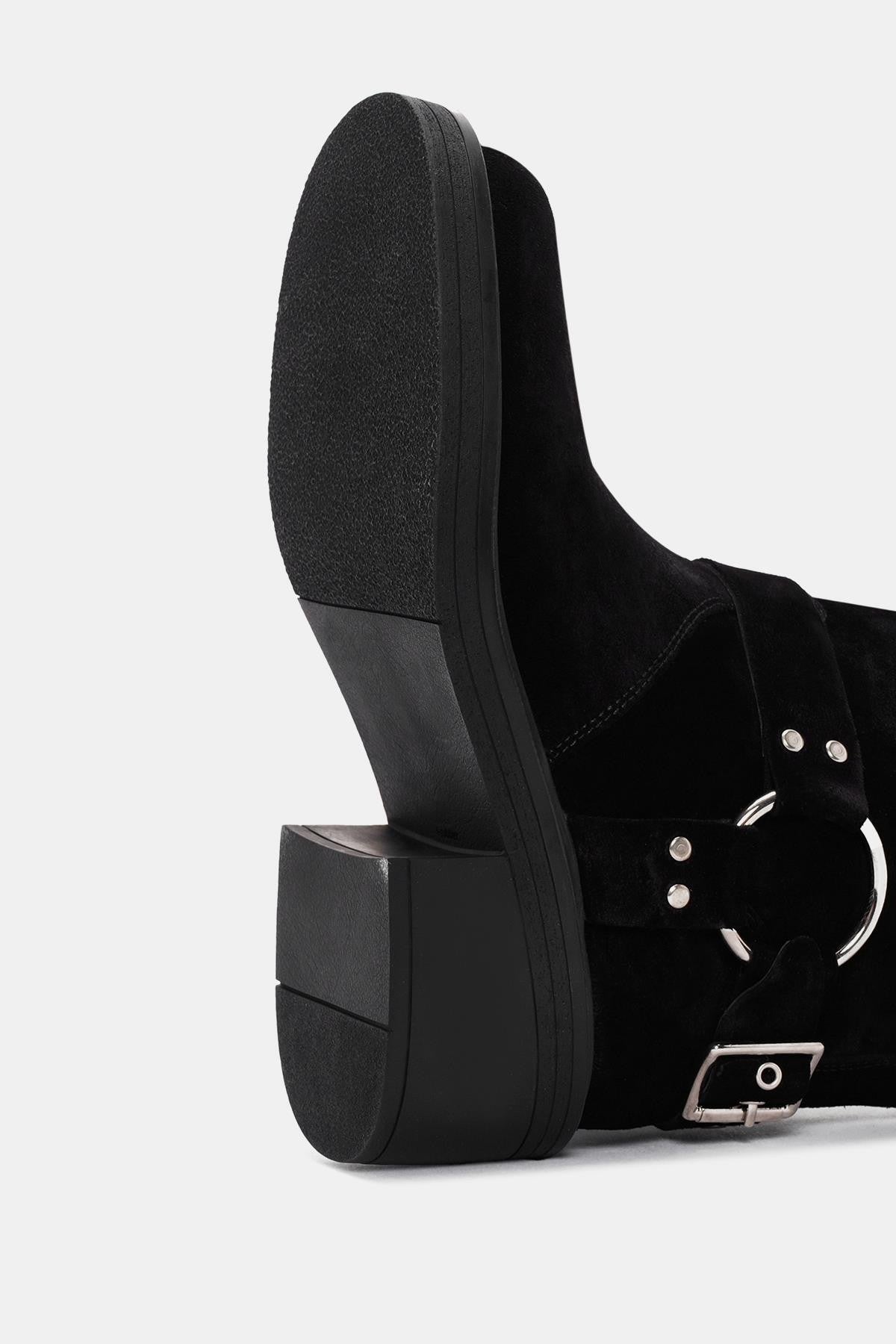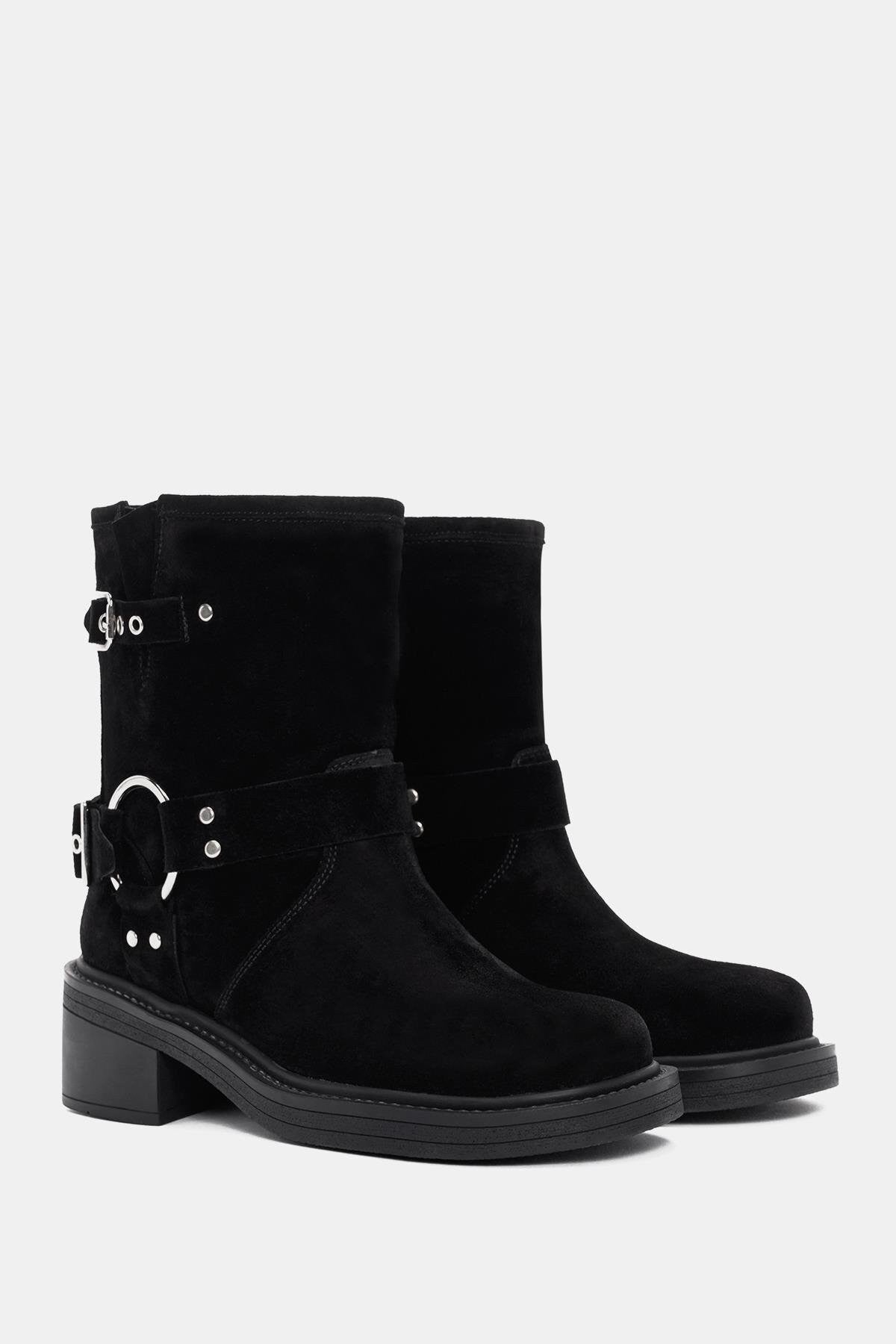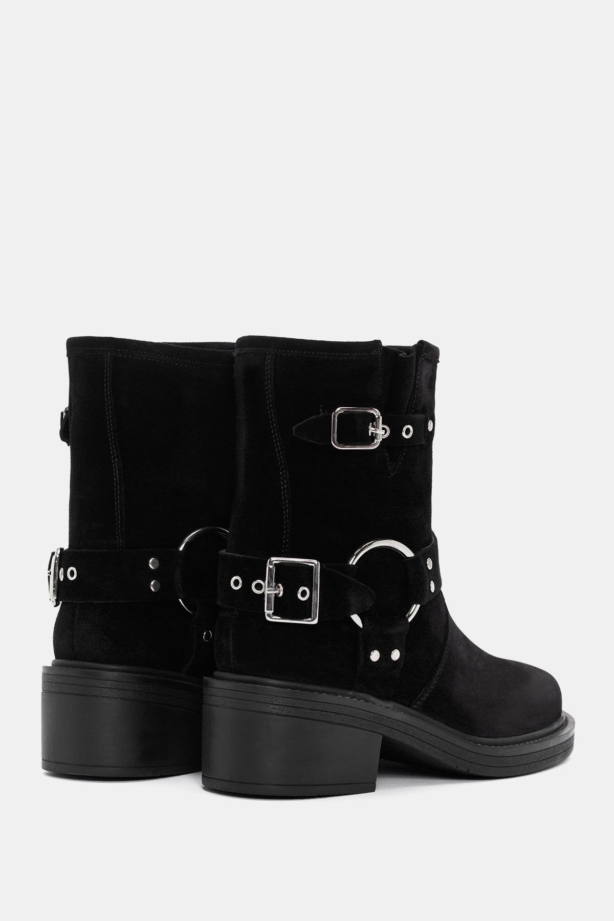 Teknik: Siyah renkli, toka detaylı süet deri bot. Günlük ve şık kombinlere güçlü bir stil katar.