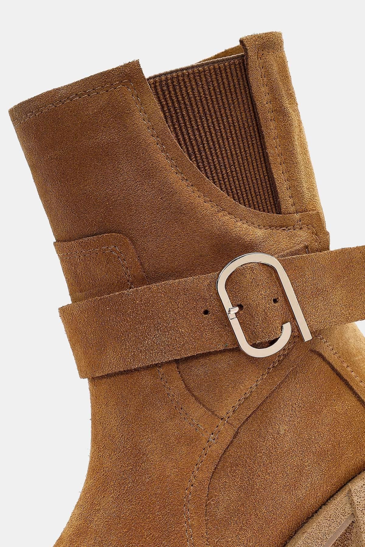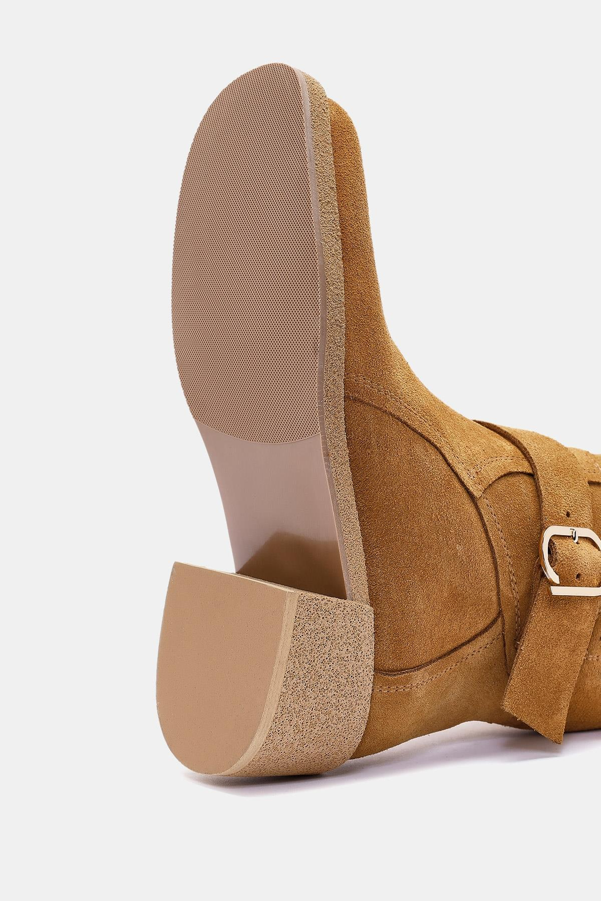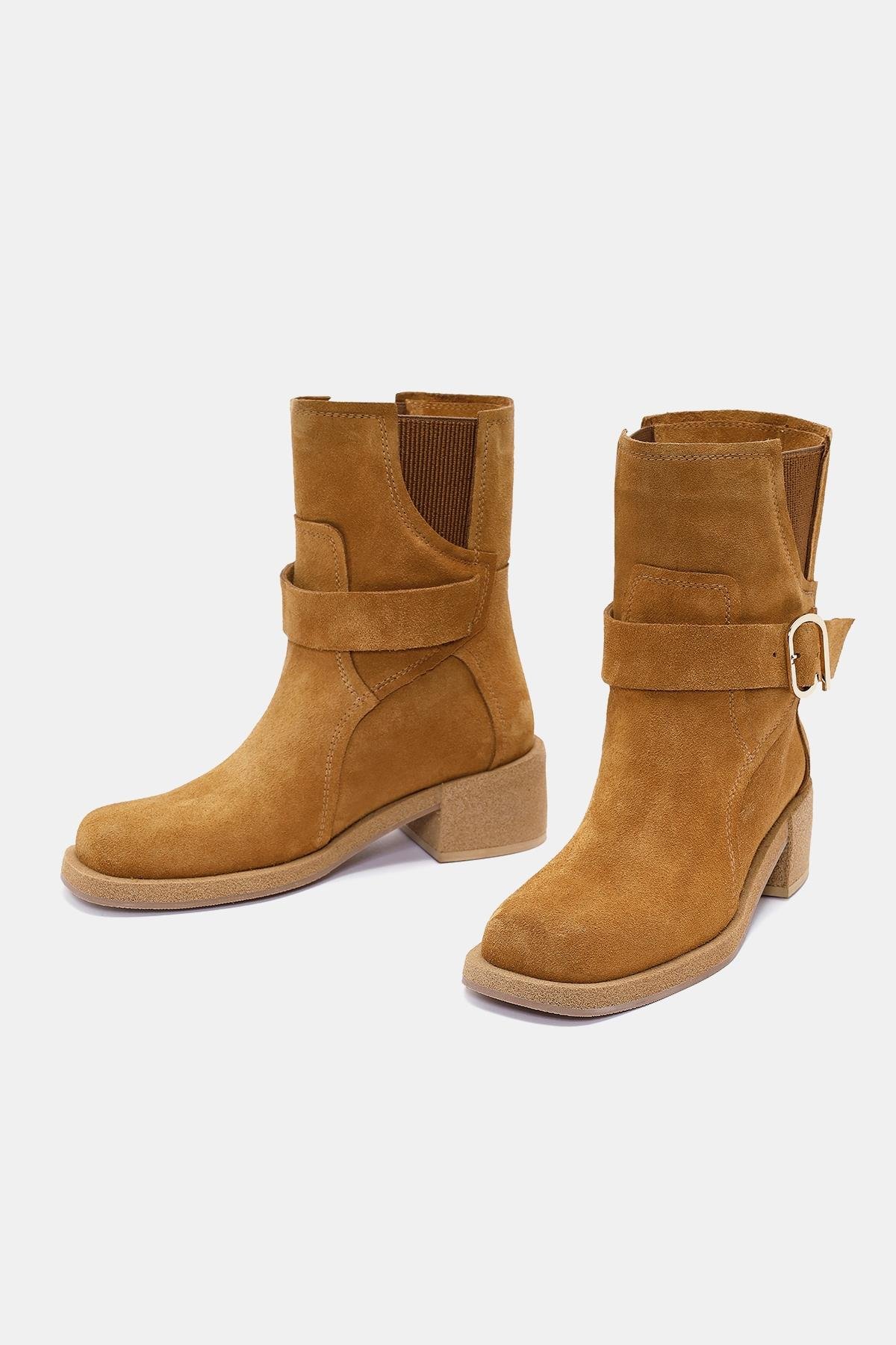 Rafles Kadın Camel Gerçek Süet Deri Toka Detaylı Kalın Topuklu Bot, şıklığı ve rahatlığı bir araya getiren zarif bir bot modelidir. İşte bu botun temel özellikleri: