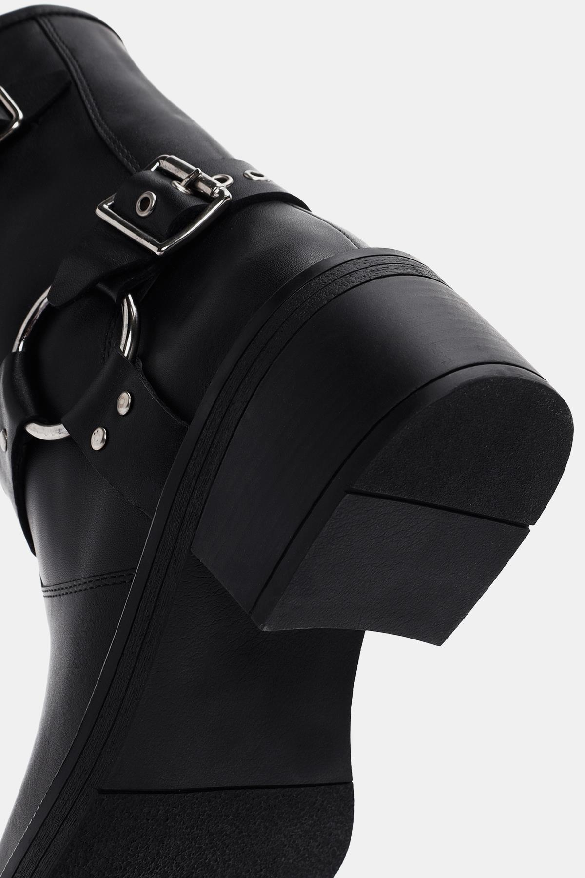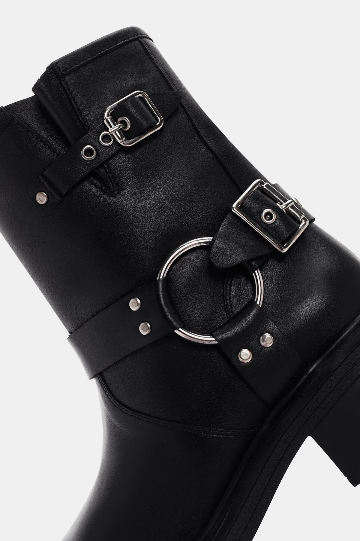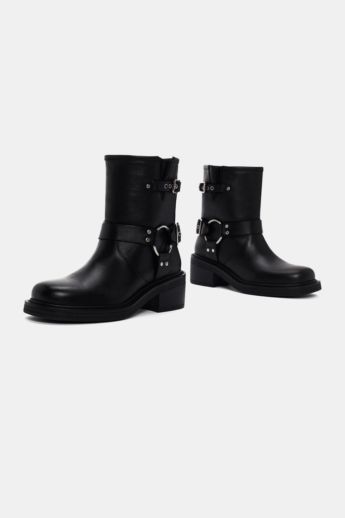 Bu botun dış yüzeyi gerçek deri ile kaplanmış, böylece kaliteli ve dayanıklı bir malzeme kullanılarak üretilmiş. Siyah renk seçimi, botu her tarza uyumlu hale getirirken, tokalar ise ekstra bir şıklık katıyor.