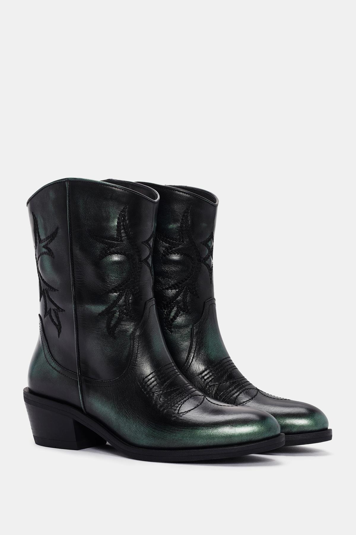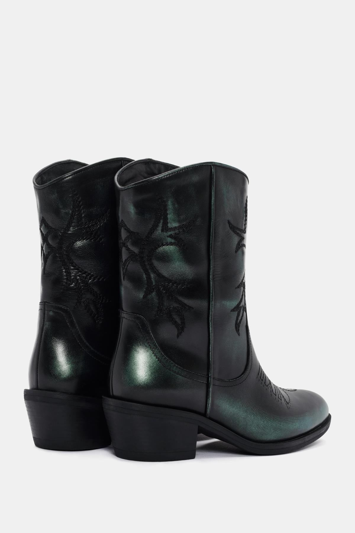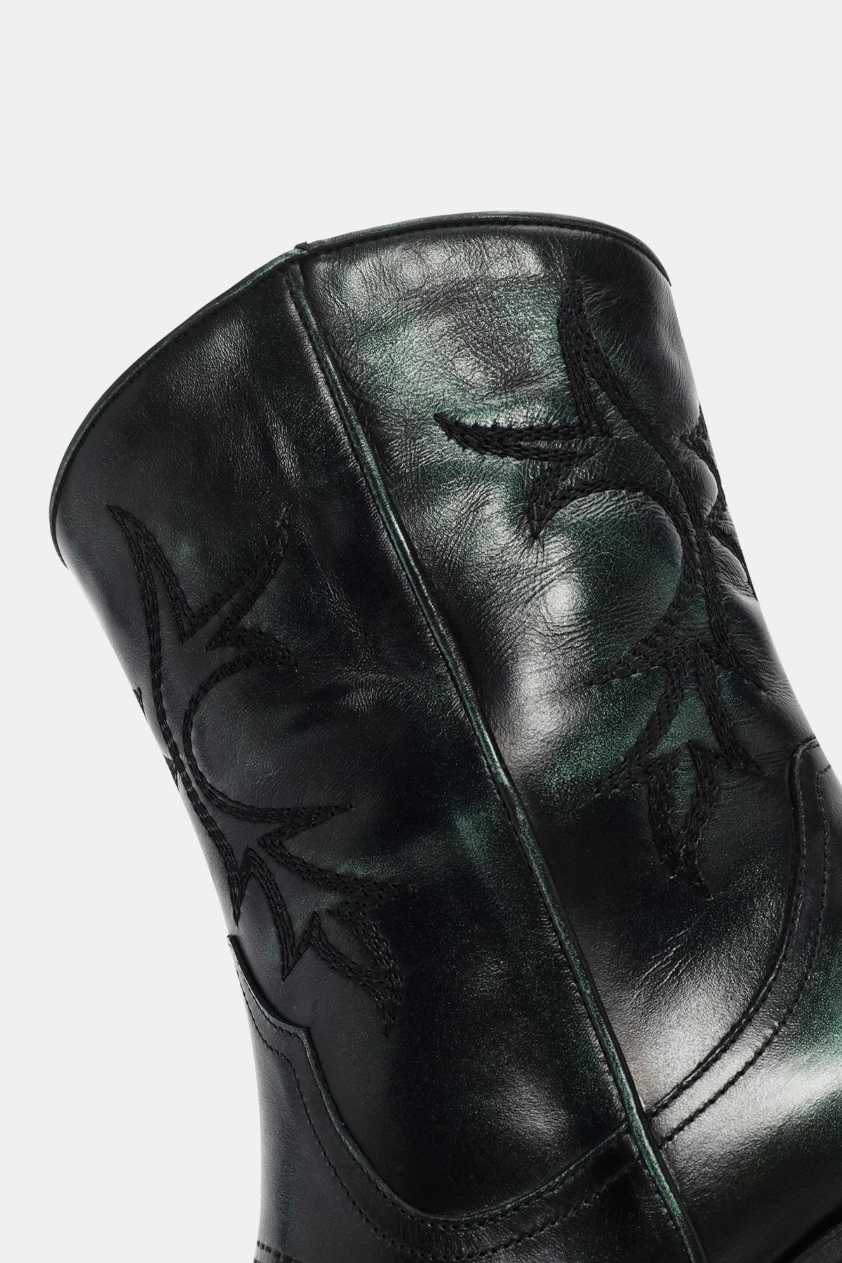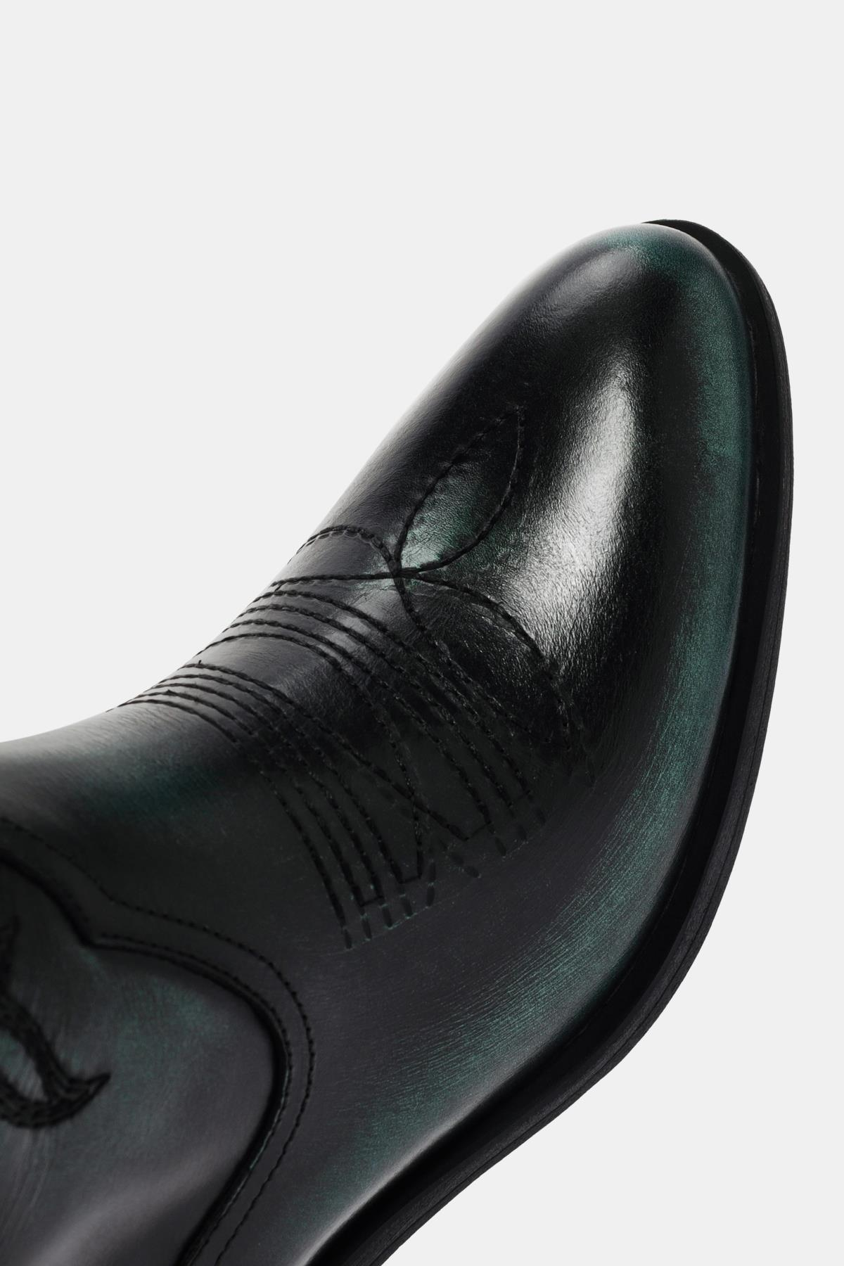 Botun dış yüzeyinde gerçek deri kullanılmıştır ve yeşil metalik bir renge sahiptir. Bu özellik, botu göz alıcı ve çarpıcı kılar, her adımda dikkat çekmenizi sağlar. Western tarzındaki detaylar ise cesur bir duruş ve karakter katıyor.
