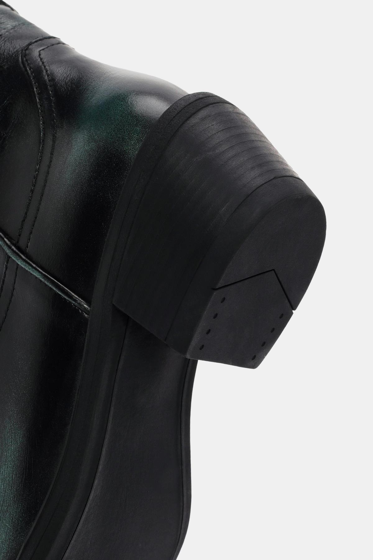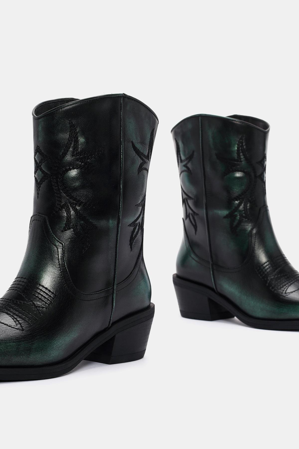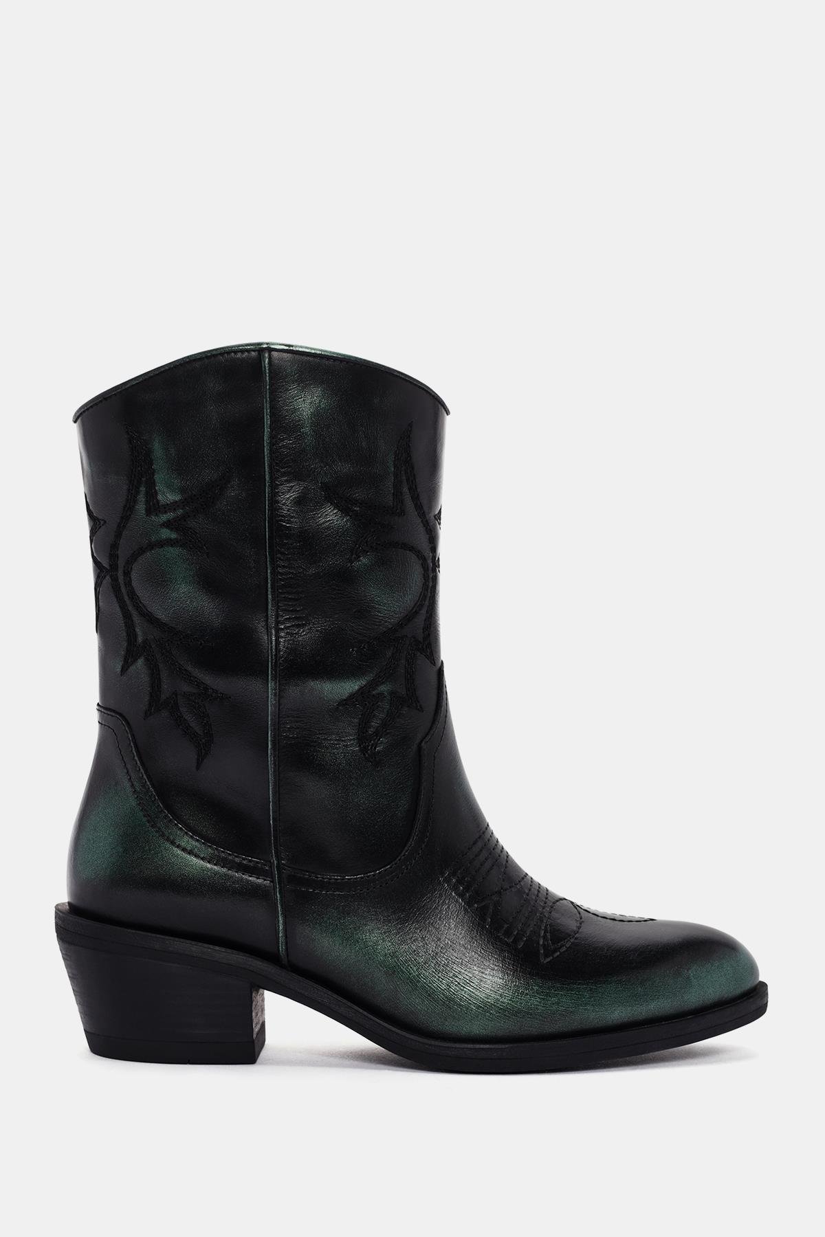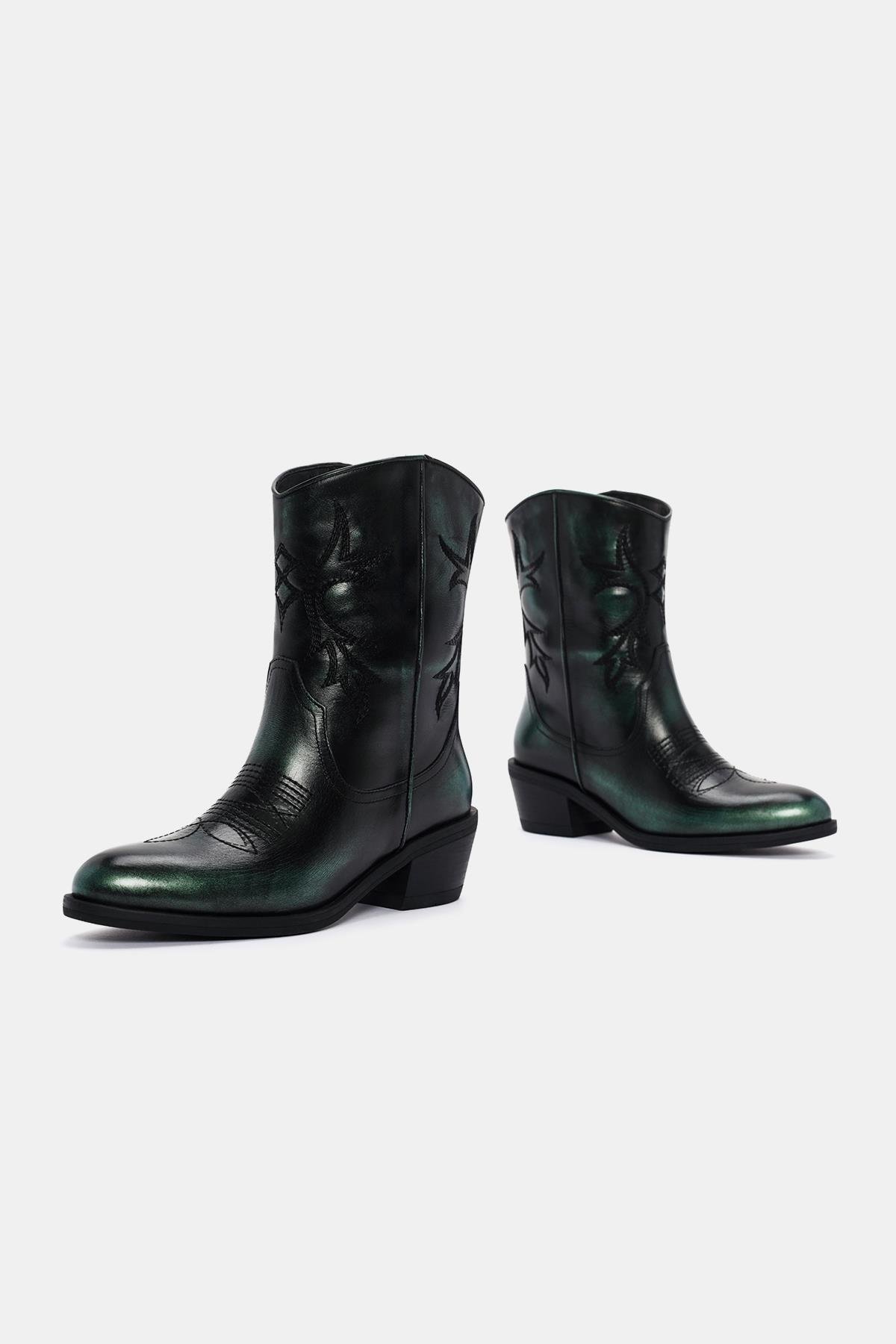 Botun dış yüzeyinde gerçek deri kullanılmıştır ve yeşil metalik bir renge sahiptir. Bu özellik, botu göz alıcı ve çarpıcı kılar, her adımda dikkat çekmenizi sağlar. Western tarzındaki detaylar ise cesur bir duruş ve karakter katıyor.