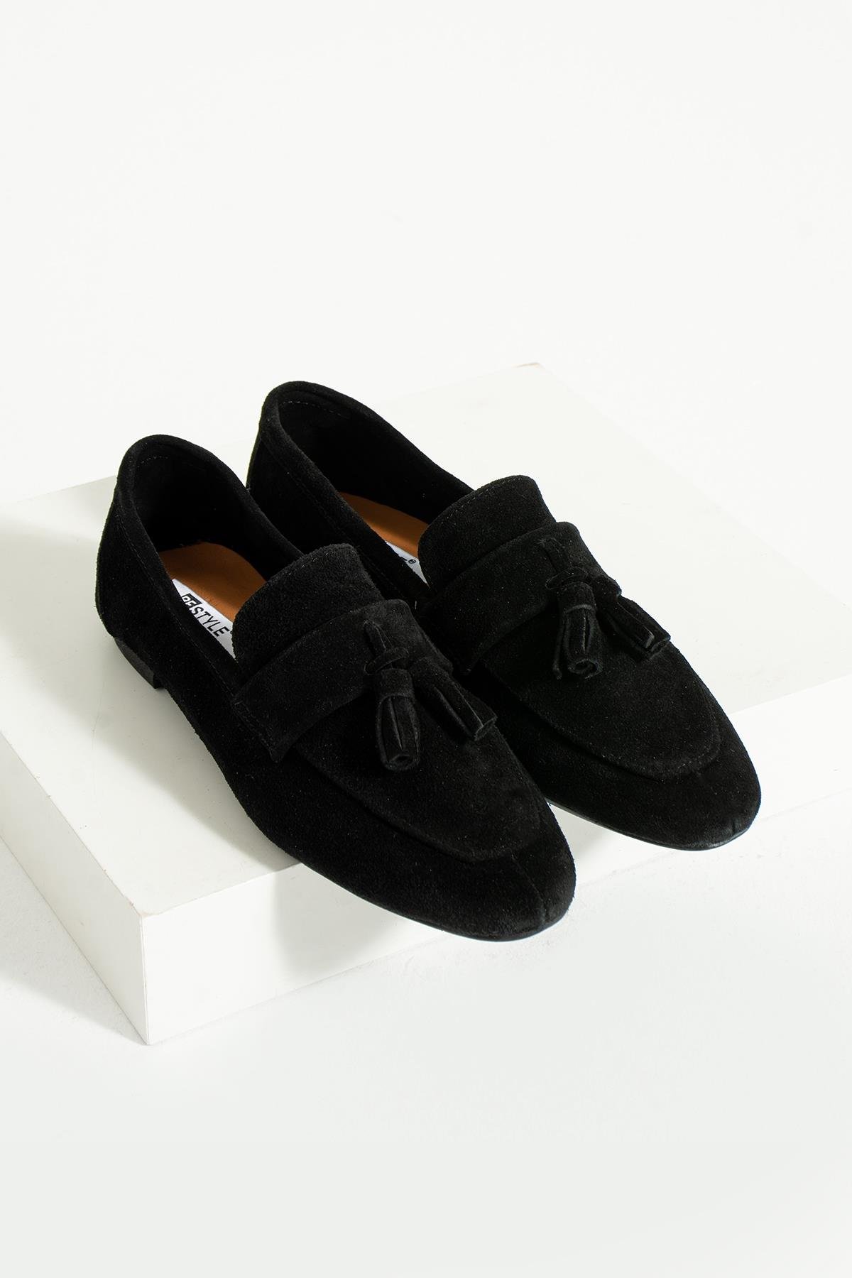 Trufle Püskül Detaylı Siyah Süet Hakiki Deri Kadın Mokasen, klasik siyahın zamansız şıklığını ve zarafetini ayağınıza taşıyor. 1 cm topuk yüksekliği ile hem şıklık hem de rahatlık sunan bu mokasen, hakiki süet deri dış materyali ve deri iç materyali ile lüks bir deneyim yaşatıyor.