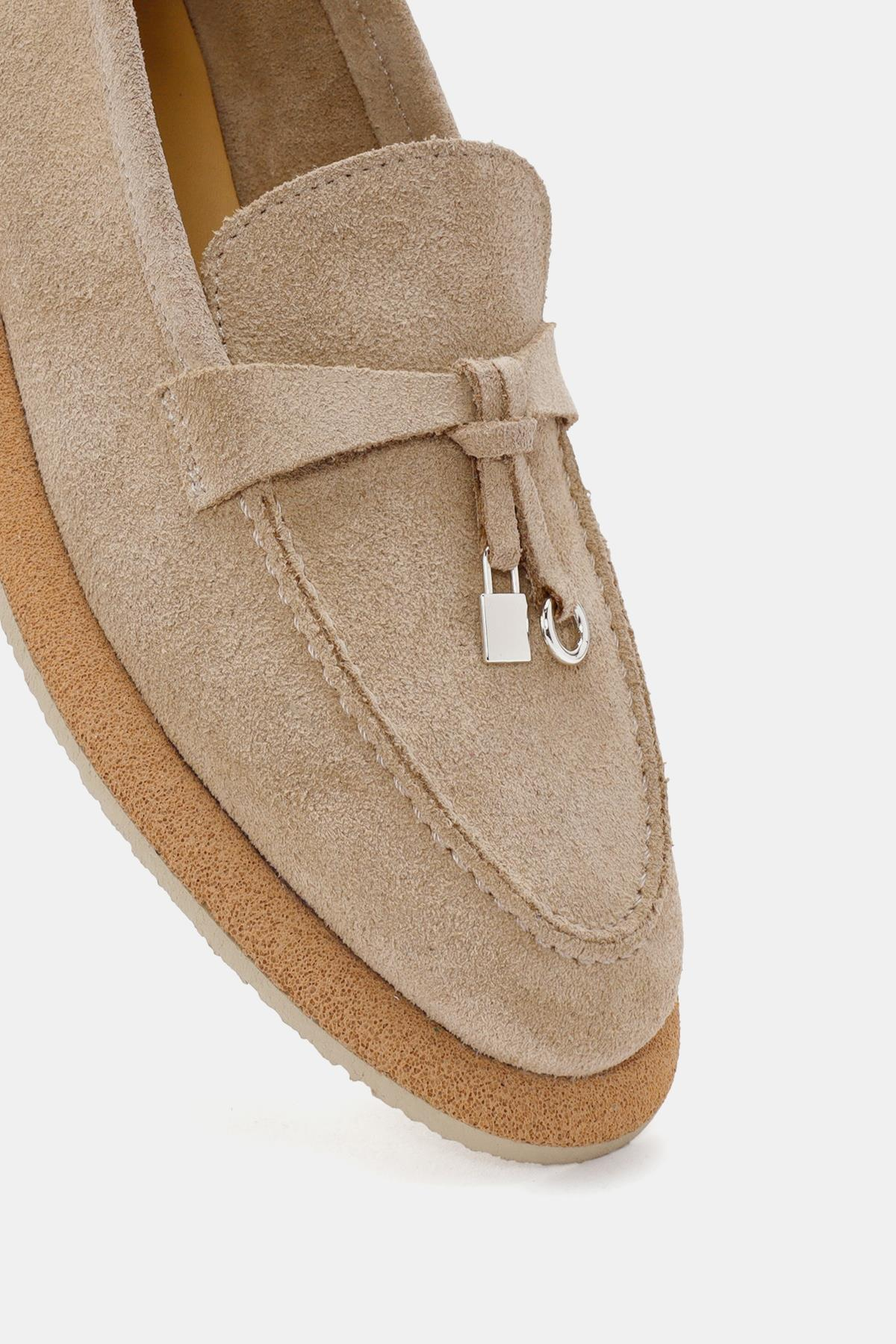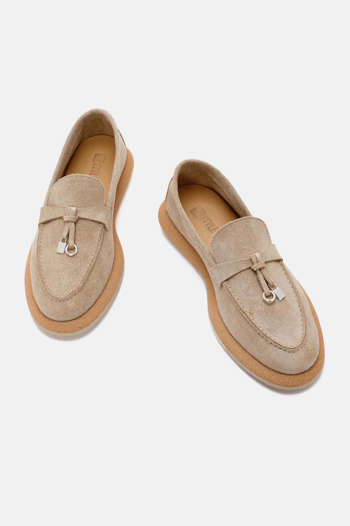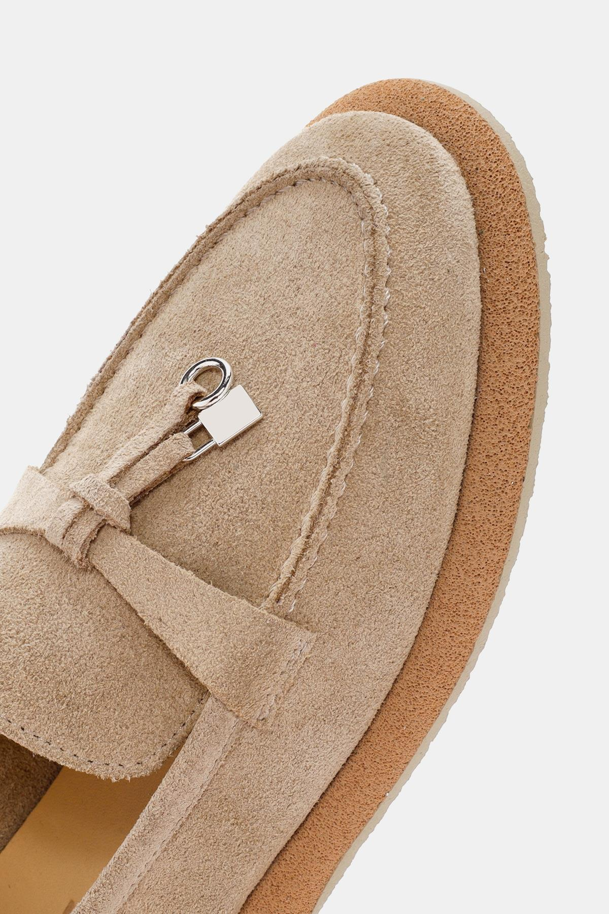 Aden Kadın Bej Süet Deri Loafer, zarif ve rahat tasarımıyla günlük kullanım için mükemmel bir tercihtir. Yumuşak süet deri malzemesi, ayaklarınıza konfor sunarken, bej rengi çeşitli kıyafetlerle kolayca uyum sağlar.