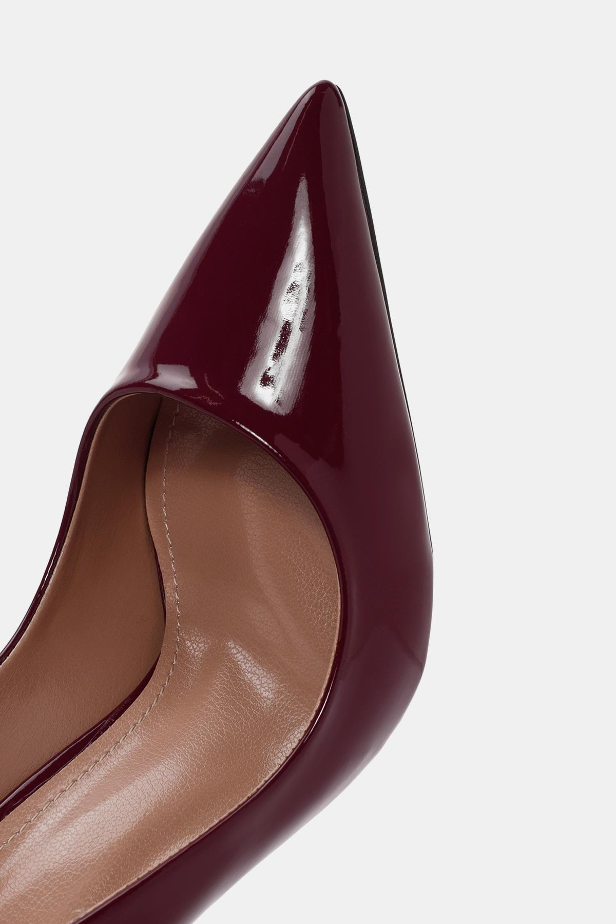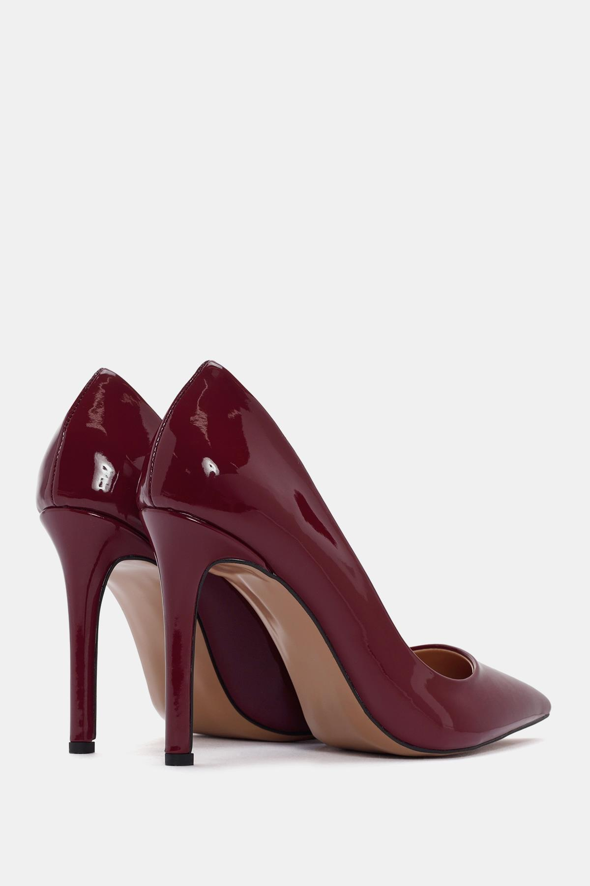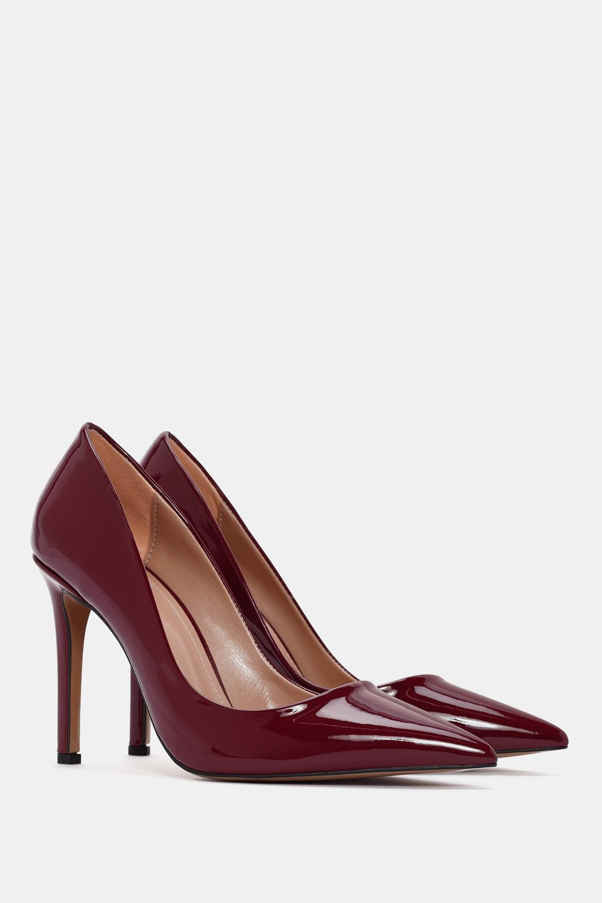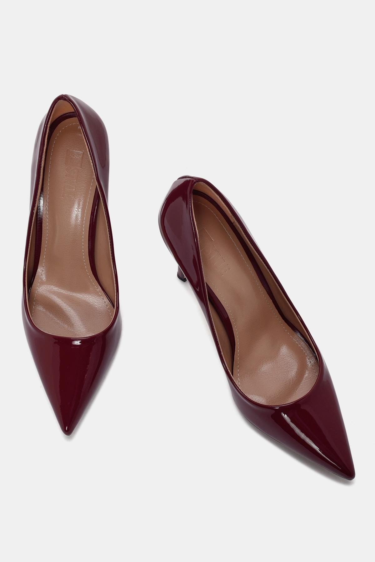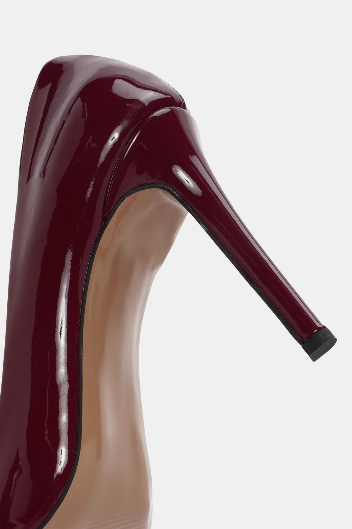 Bu ayakkabı, yüksek topuklu tasarımıyla zarif bir görünüm sunarken, bordo rugan malzemesiyle de öne çıkıyor.