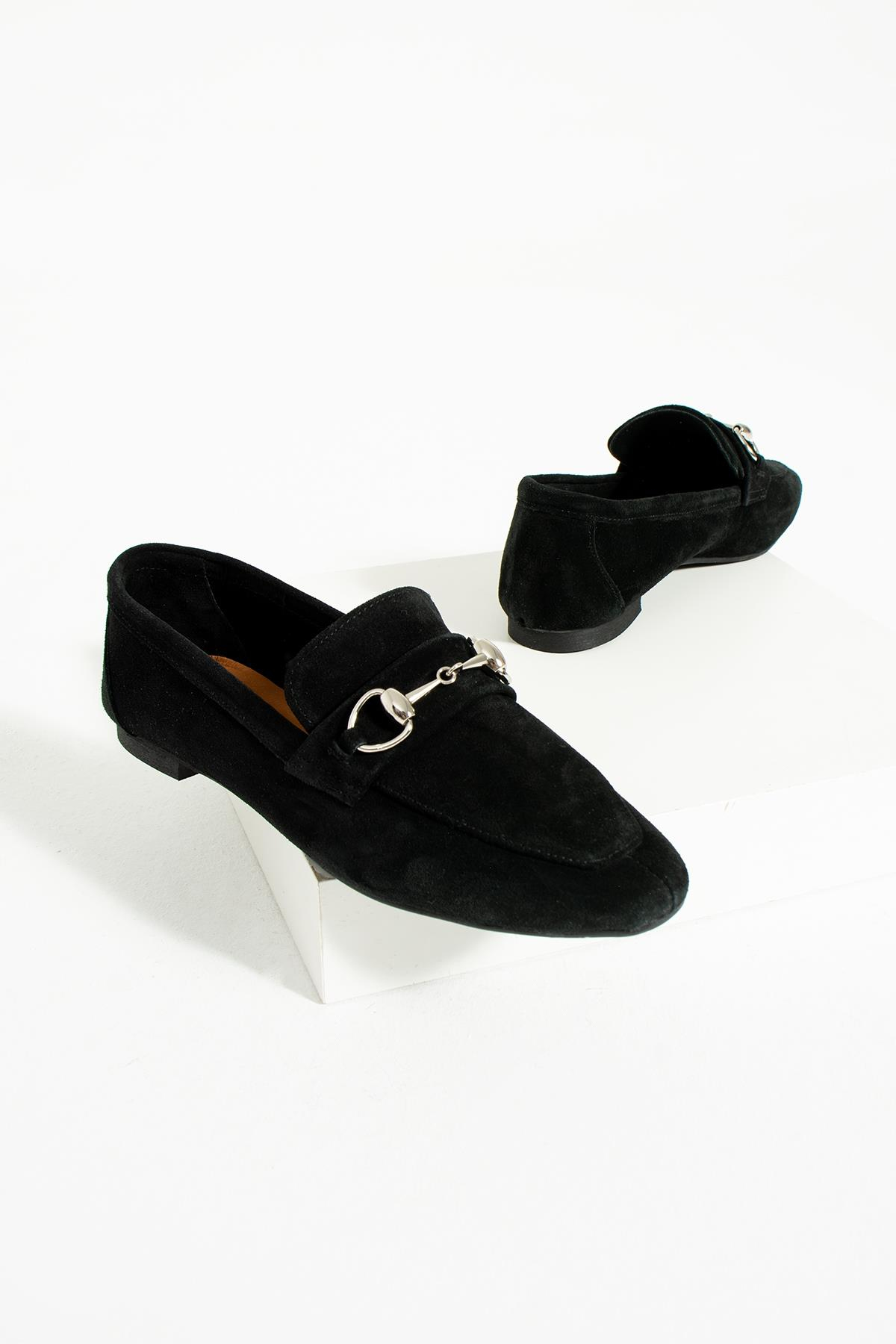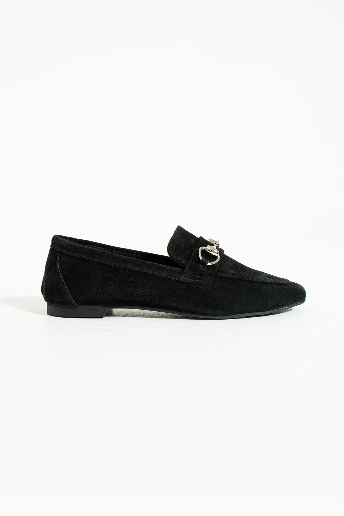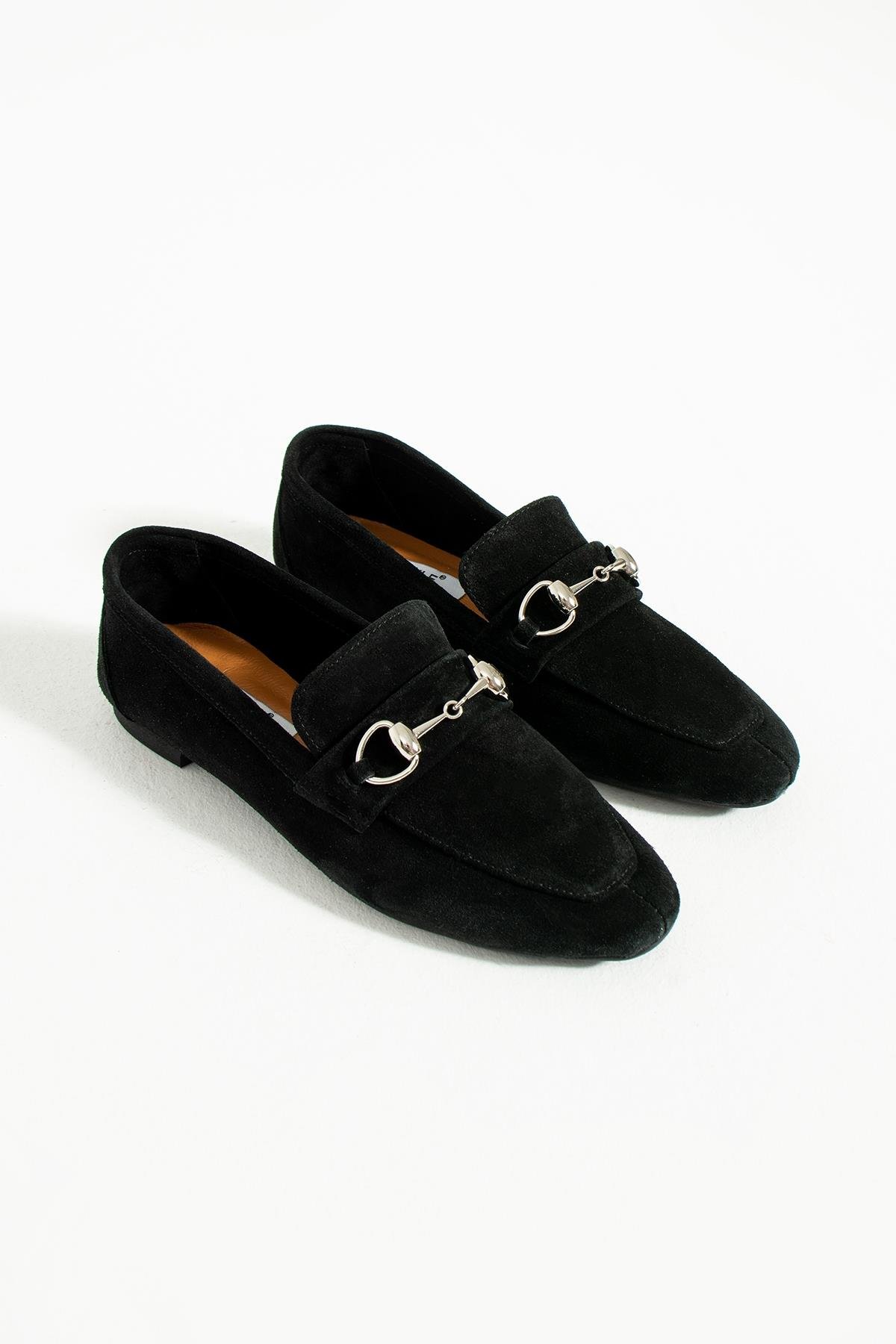Evan Kadın Siyah Gerçek Süet Deri Klasik Loafer, iş toplantılarından günlük gezilere kadar her ortamda giyebileceğiniz çok yönlü bir ayakkabıdır. Siyah rengin zarafeti, ayakkabıya sofistike bir hava katarak gardırobunuzdaki her kıyafetle uyum sağlar. Hakiki süet derinin yumuşak dokusu, her adımda konfor ve esneklik sunar.