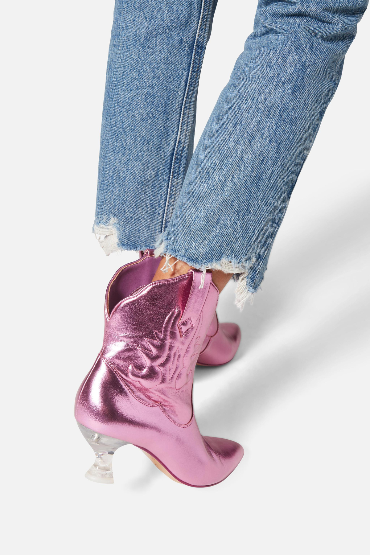 Katy Perry Annie-O Kadın Pembe Western Tasarım Bot, modern tasarımı ve canlı pembe rengiyle gardırobunuzun enerjik ve dikkat çekici bir parçası olacak. Metalik Nappa malzemenin parlak dokusu, botunuzu her ortamda fark edilir kılarken, Western tarzının klasik öğeleri modern bir yorumla buluşuyor.